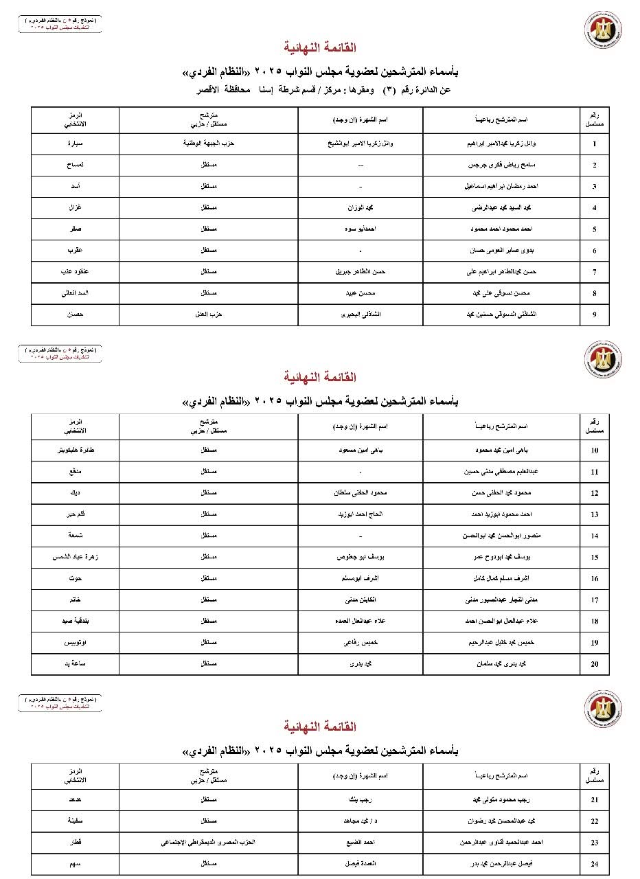 رسمياً الوطنية للانتخابات تعلن الكشوف النهائية للمرشحين بمحافظة الأقصر (فردي)