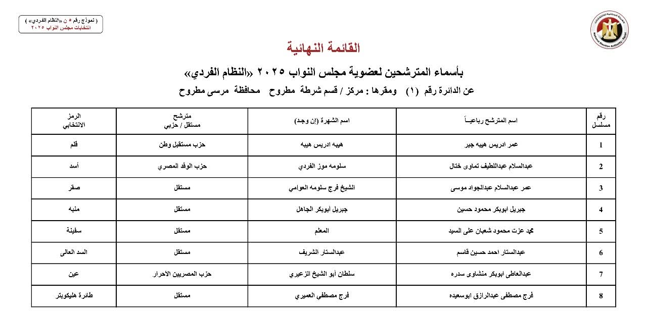 أعلنت الهيئة الوطنية للانتخابات اليوم رسميًا الكشوف النهائية للمرشحين بمحافظة مطروح بالنظام الفردي في انتخابات مجلس النواب 2025.