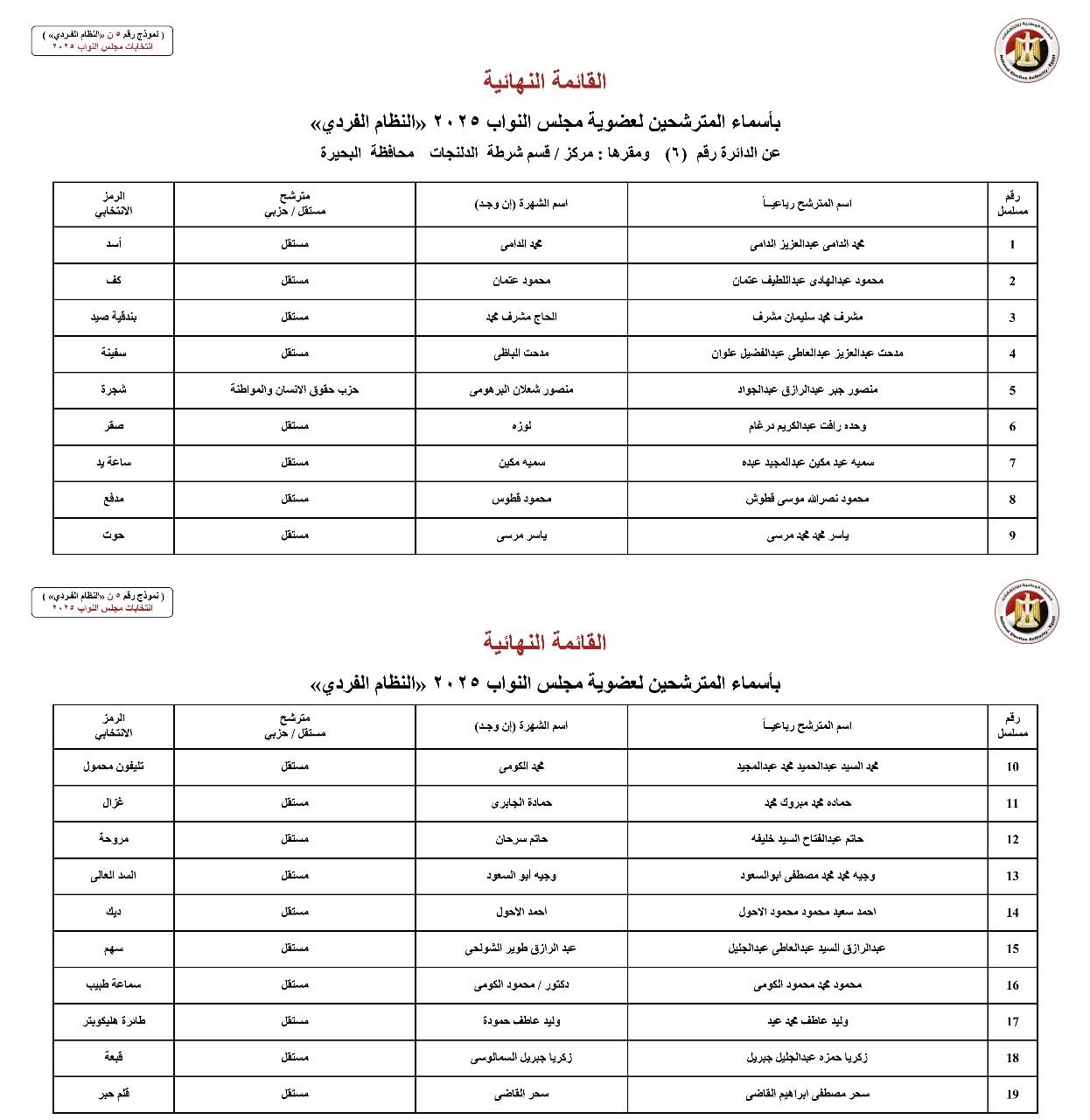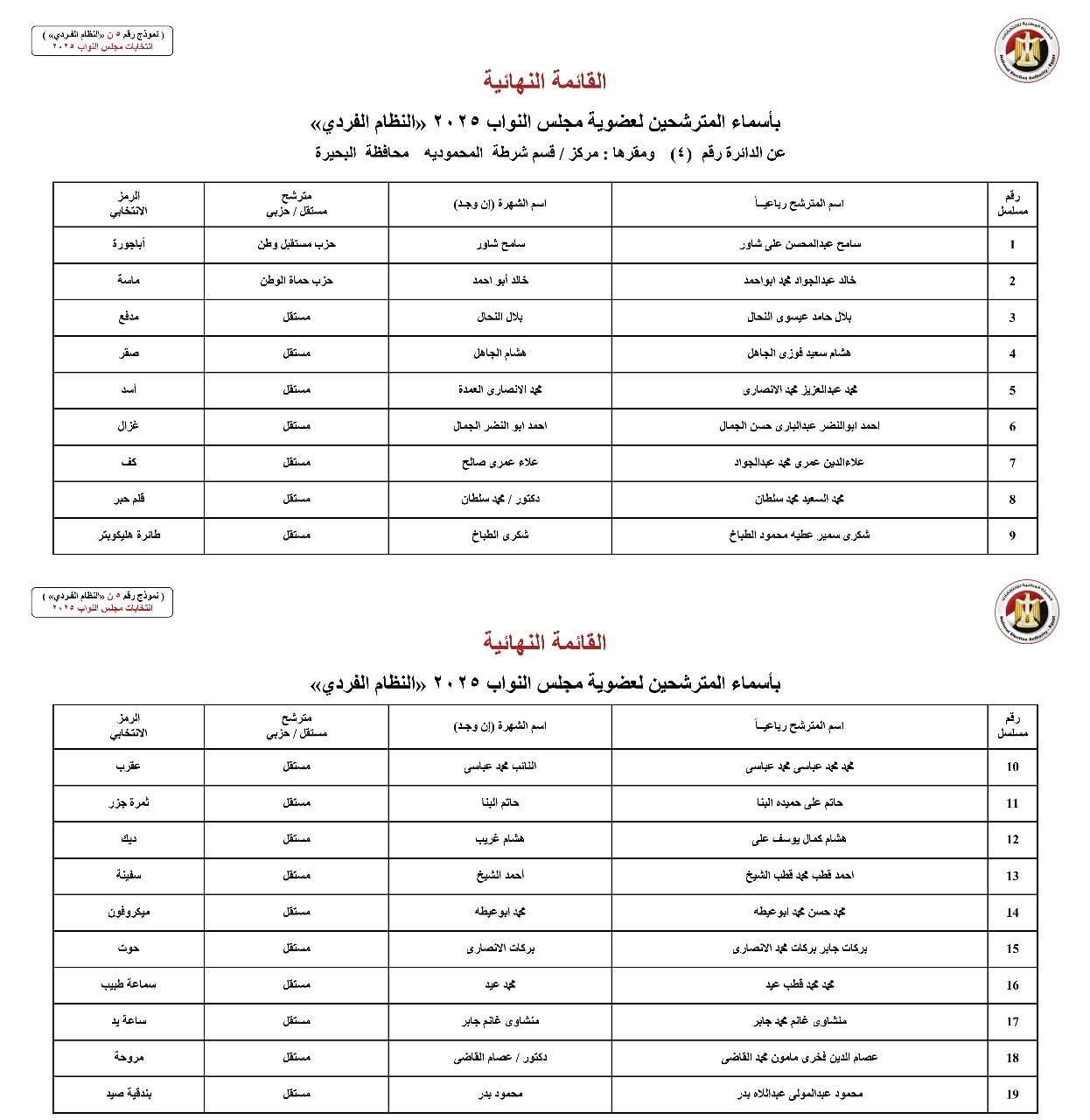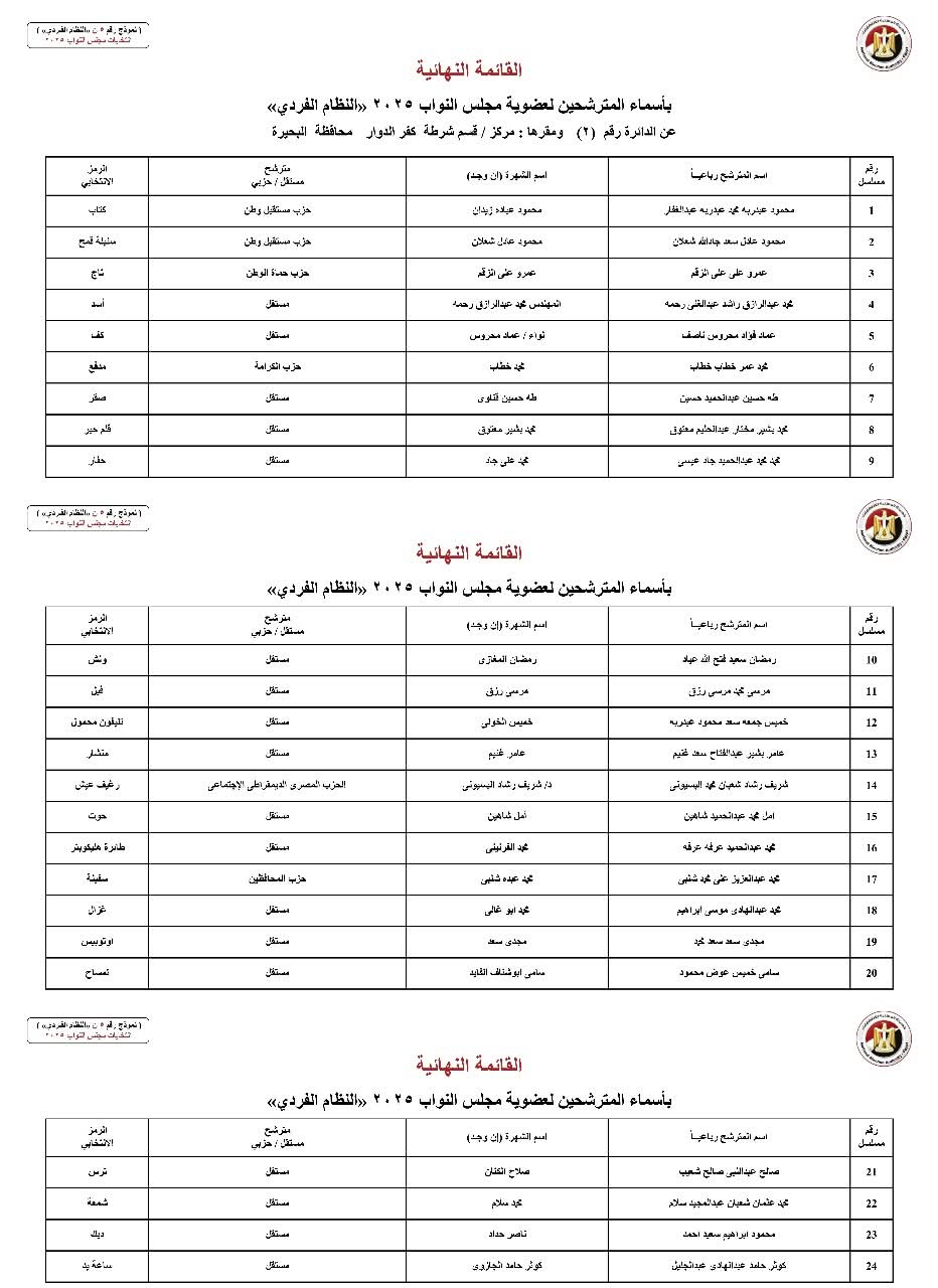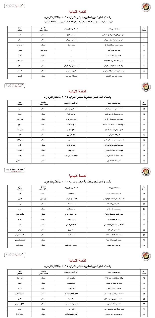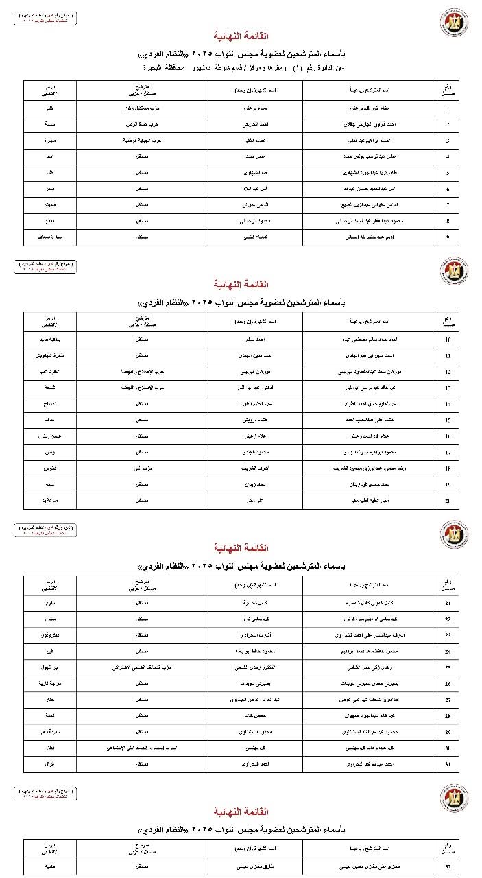 أعلنت الهيئة الوطنية للانتخابات اليوم رسميًا الكشوف النهائية للمرشحين بمحافظة البحيرة بالنظام الفردي في انتخابات مجلس النواب 2025.