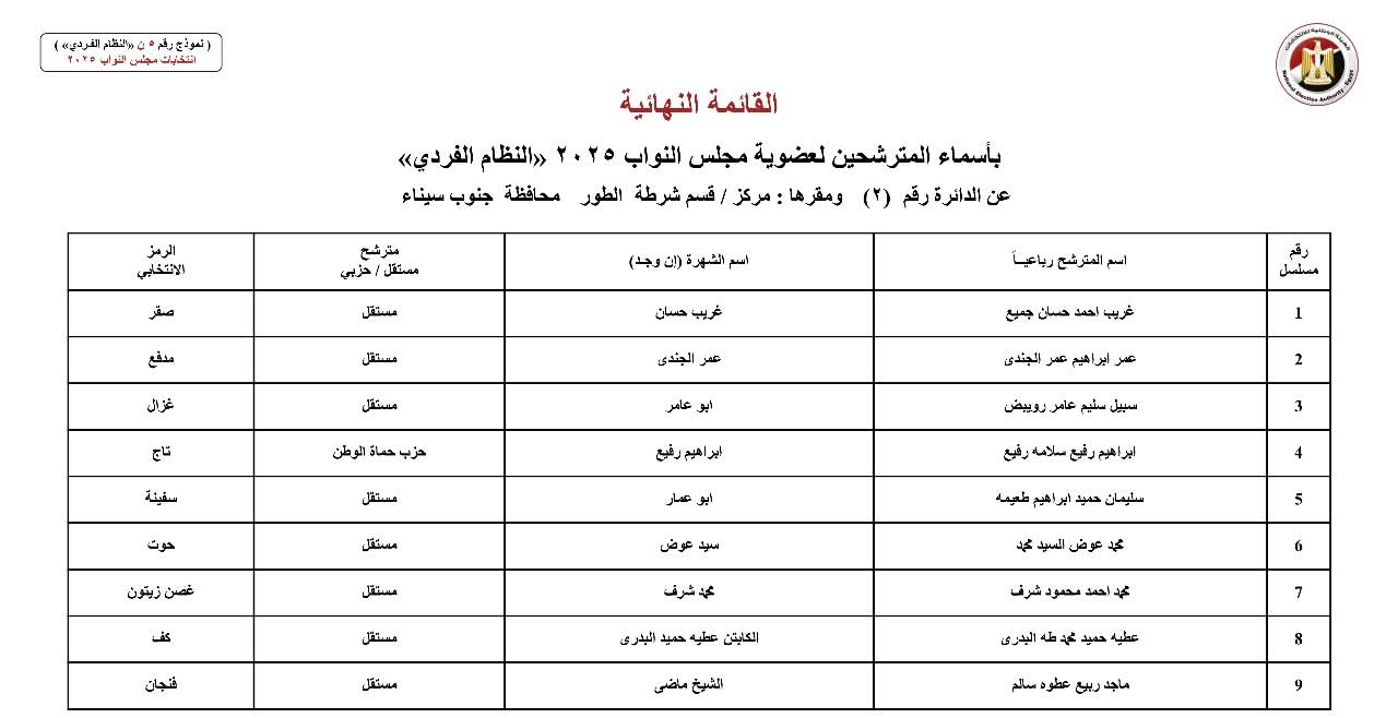 أعلنت الهيئة الوطنية للانتخابات اليوم رسميًا الكشوف النهائية للمرشحين بمحافظة جنوب سيناء بالنظام الفردي في انتخابات مجلس النواب 2025.