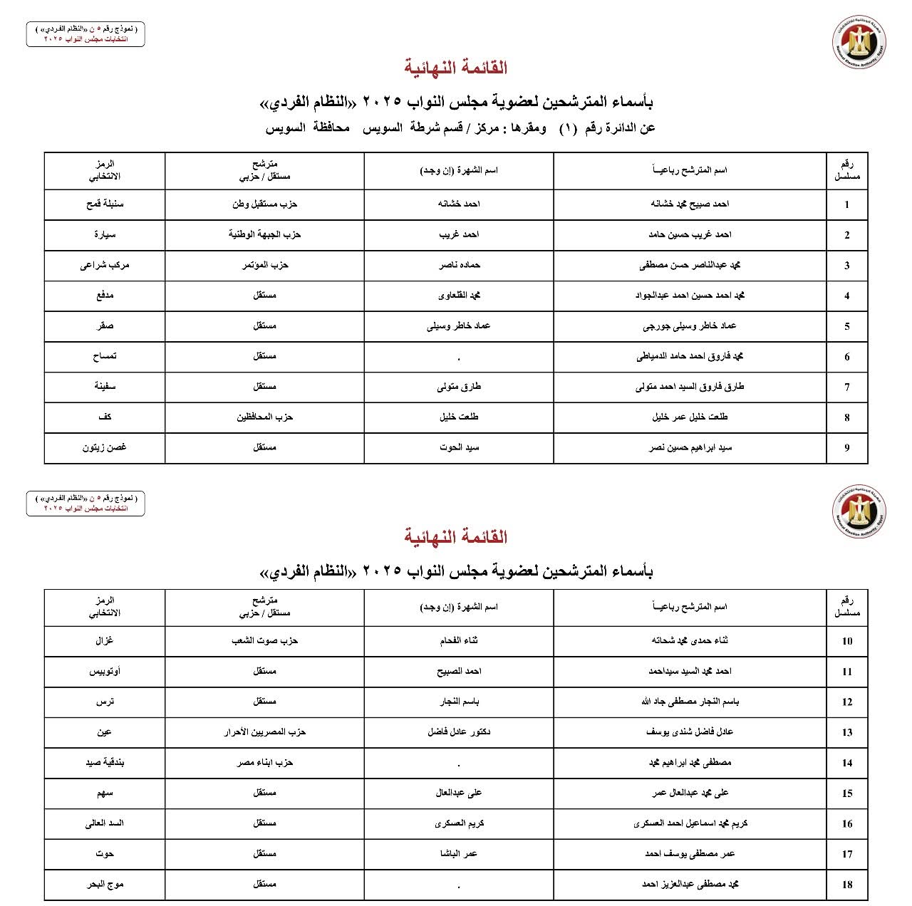 أعلنت الهيئة الوطنية للانتخابات اليوم رسميًا الكشوف النهائية للمرشحين بمحافظة السويس بالنظام الفردي في انتخابات مجلس النواب 2025.