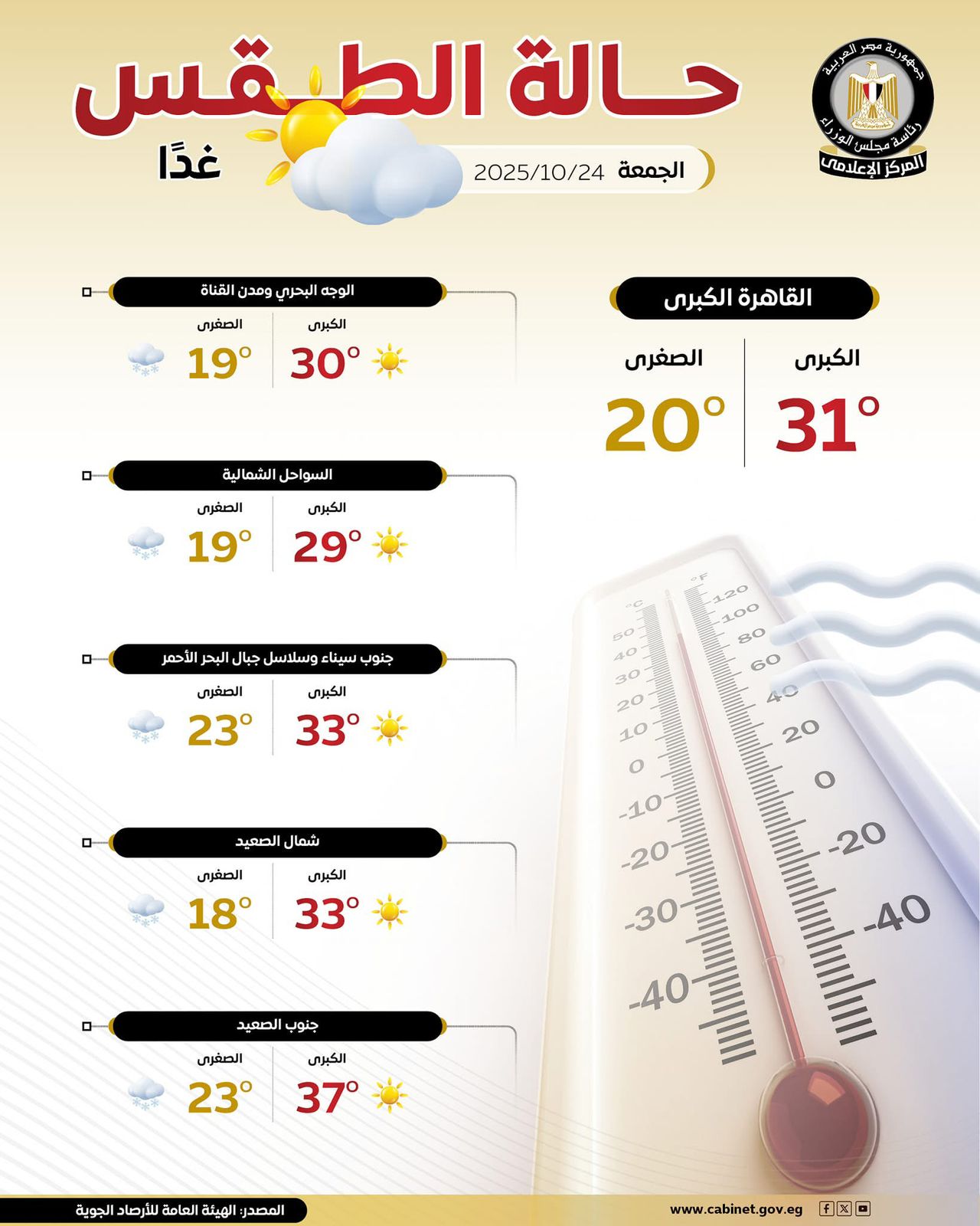 أعلن المركز الإعلامي لمجلس الوزراء نقلًا عن الهيئة العامة للأرصاد الجوية تفاصيل حالة الطقس المتوقعة اليوم الجمعة الموافق 24 أكتوبر 2025، والتي تشهد ارتفاعًا طفيفًا في درجات الحرارة على معظم أنحاء الجمهورية، مع طقس مائل للحرارة نهارًا ولطيف ليلًا.