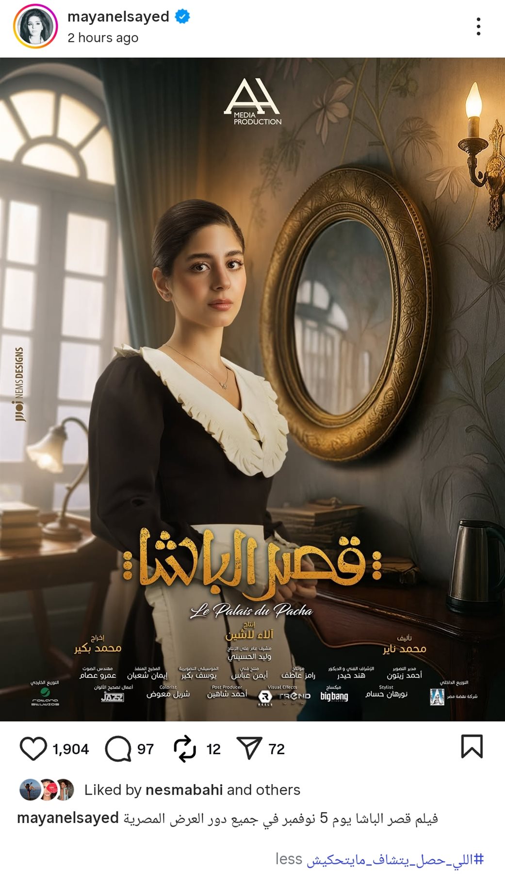 وكتبت من خلال حسابها الرسمي عبر موقع تبادل الصور والفيديوهات القصيرة إنستجرام، قالت: فيلم قصر الباشا يوم 5 نوفمبر في جميع دور العرض المصرية.