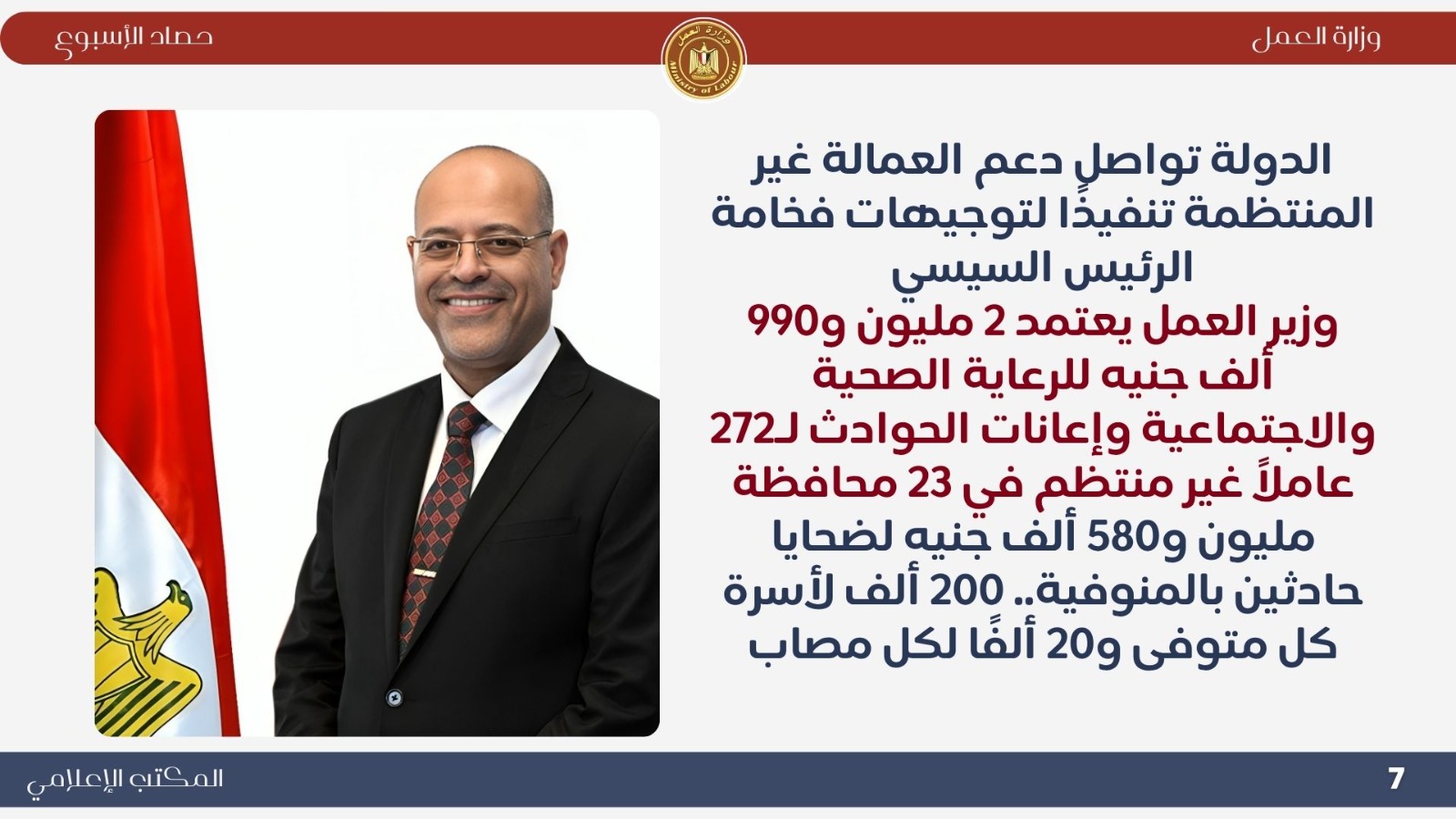 تنفيذًا لتوجيهات الرئيس السيسي بدعم العمالة غير المنتظمة ،اعتمد الوزير محمد جبران صرف 2 مليون و990 ألف جنيه للرعاية الاجتماعية والصحية وإعانات الحوادث، بينها مليون و580 ألف جنيه لضحايا حادثين بمحافظة المنوفية، بواقع 200 ألف جنيه لكل متوفى و20 ألفًا لكل مصاب. وأكد الوزير استمرار تقديم الدعم الكامل للعمالة غير المنتظمة في جميع المحافظات.