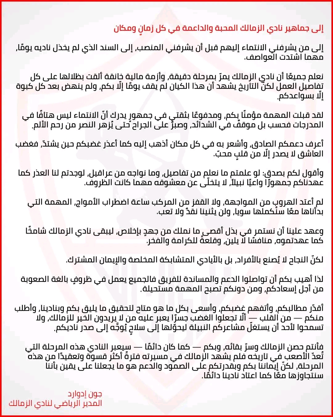 رسالة جون ادوارد لجماهير الزمالك