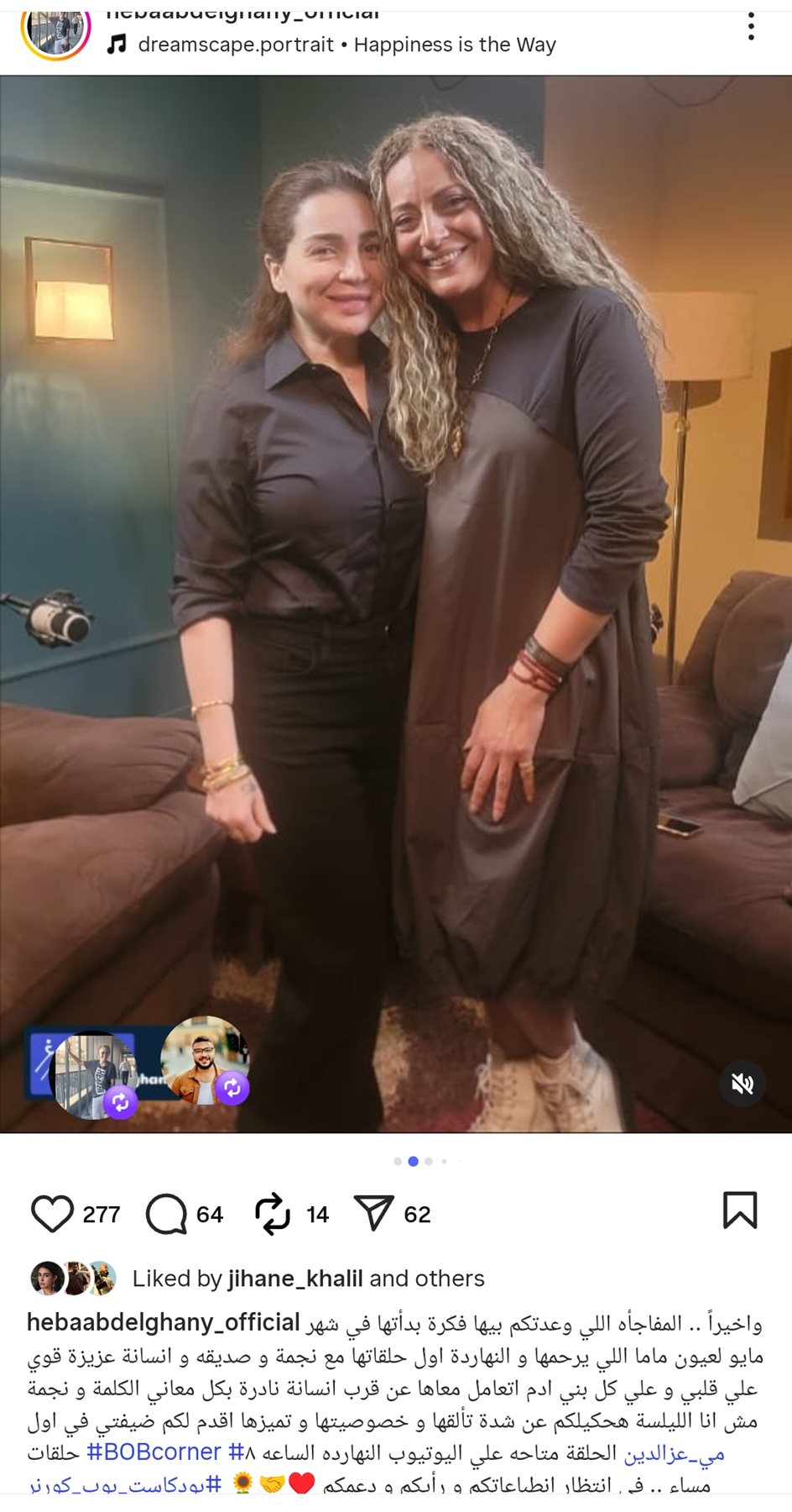 ونشرت هبة عبد الغني صورًا من الحلقة الأولى التي تجمعها بـ مي عز الدين، وذلك من خلال حسابها الرسمي عبر موقع تبادل الصور والفيديوهات القصيرة إنستجرام، وكتبت: واخيراً.. المفاجأه اللي وعدتكم بيها فكرة بدأتها في شهر.