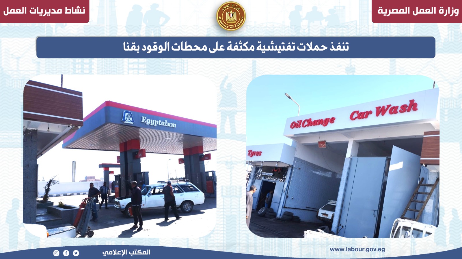 نفذت مديرية العمل بقنا حملات تفتيشية مكثفة على محطات الوقود في مجالي التفتيش العمالي والسلامة والصحة المهنية تنفيذًا لتوجيهات الوزير محمد جبران، وحرصًا من الوزارة على ضمان تطبيق أحكام قانون العمل رقم (14) لسنة 2025 ولائحته التنفيذية.
