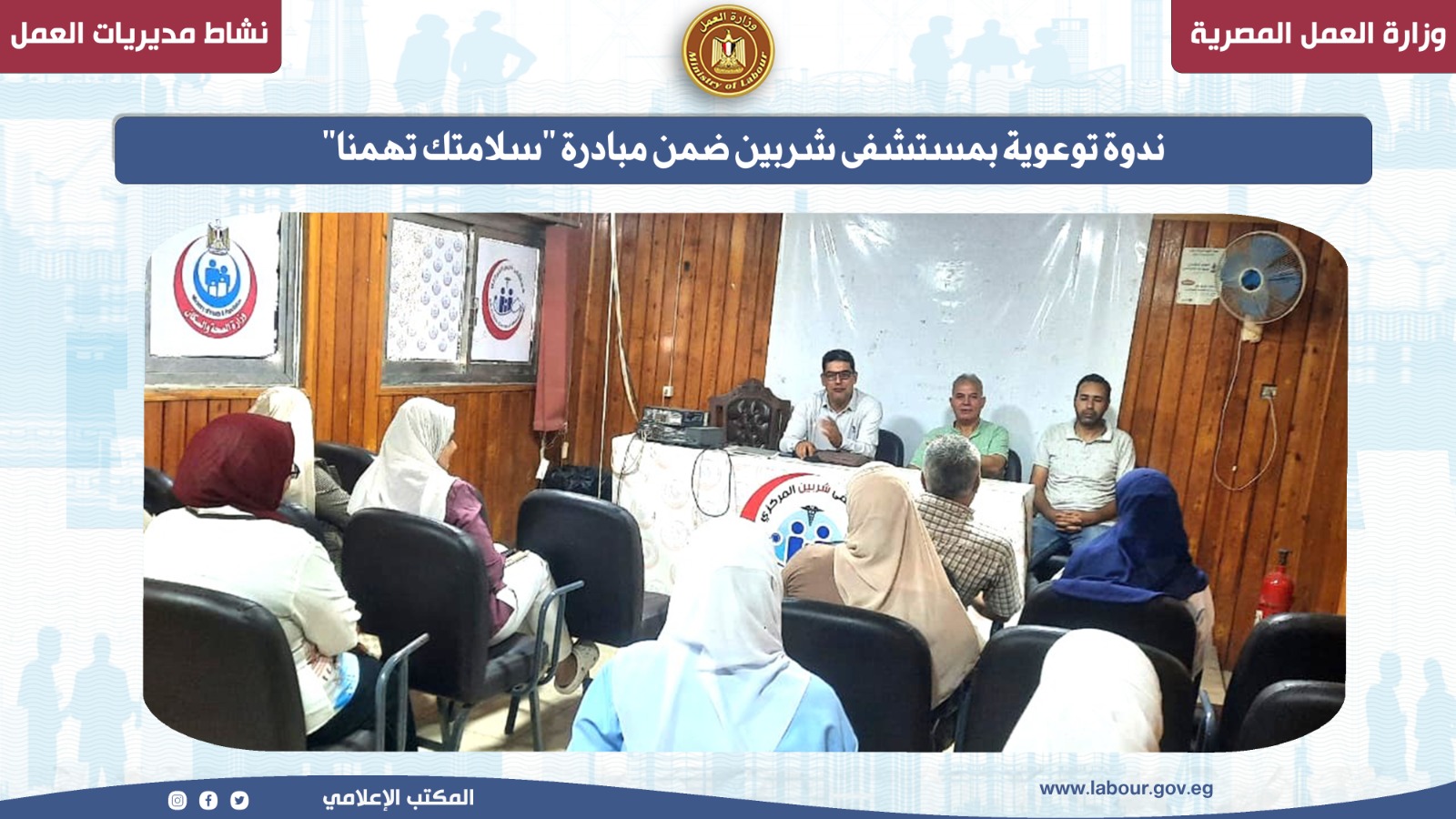 نظمت مديرية العمل بالدقهلية من خلال مكتب السلامة والصحة المهنية بشربين ندوة توعوية بمستشفى شربين المركزي ضمن فعاليات مبادرة "سلامتك تهمنا" تنفيذًا لتعليمات الوزير محمد جبران، وتحت إشراف اللواء طارق مرزوق محافظ الدقهلية.