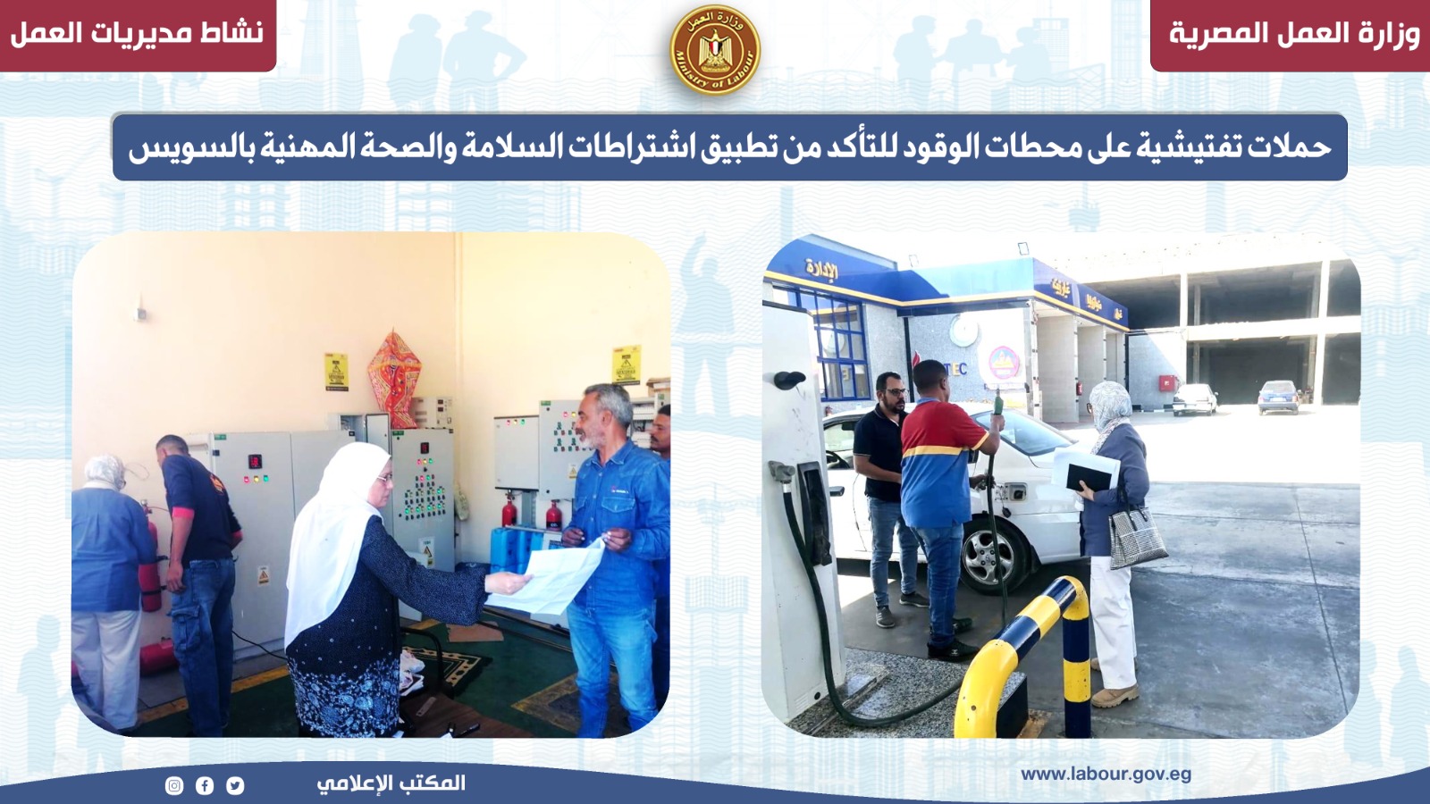 نفذت مديرية العمل بالسويس حملات تفتيش ميدانية مشتركة على محطات الوقود بنطاق المحافظة، بمشاركة مكاتب التفتيش العمالي والسلامة والصحة المهنية تنفيذًا لتوجيهات الوزير محمد جبران.