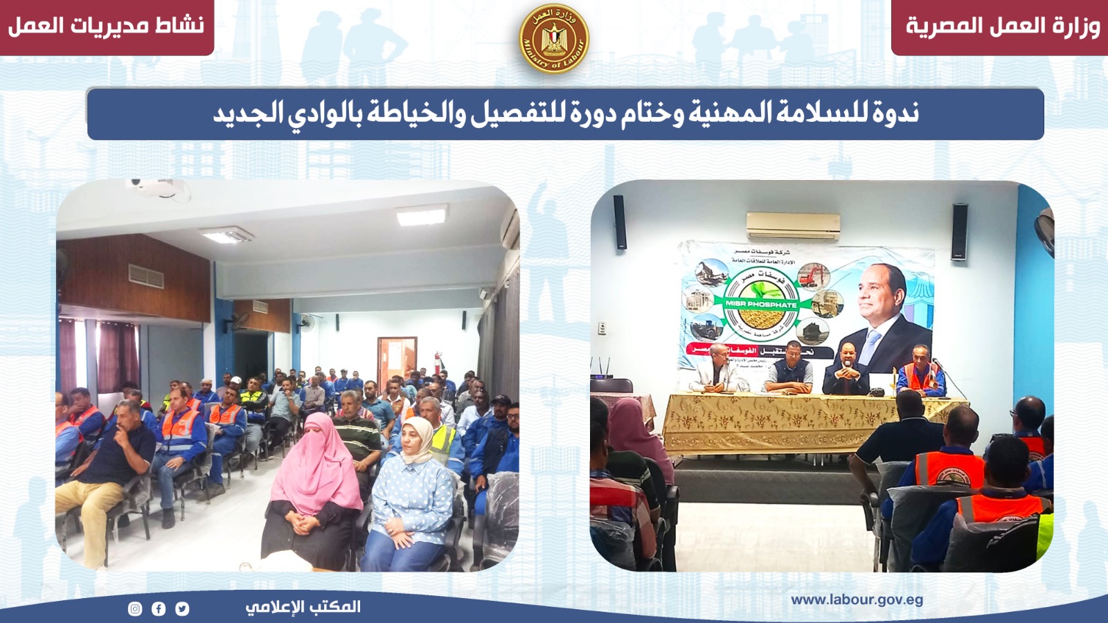 نفذت مديرية العمل بالوادي الجديد عددًا من الأنشطة الميدانية والتدريبية تنفيذًا لتوجيهات الوزير محمد جبران، وتحت إشراف أسامة إبراهيم مدير المديرية، حيث نظمت ندوة توعوية موسعة بمنطقة أبو طرطور بشركة فوسفات مصر ضمن مبادرة "سلامتك تهمنا" تناولت مبادئ السلامة والصحة المهنية والإسعافات الأولية وأحكام قانون العمل رقم (14) لسنة 2025.