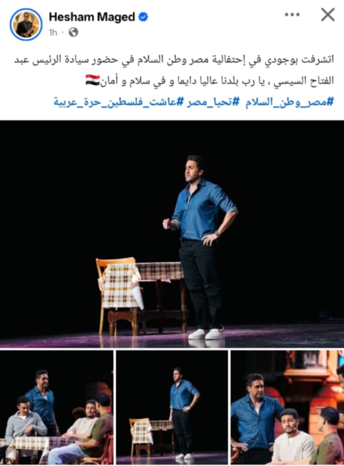 ونشر هشام ماجد عبر حسابه الشخصي "فيسبوك"، صور له خلال الاحتقالية قائلًا:اتشرفت بوجودي في إحتفالية مصر وطن السلام في حضور سيادة الرئيس عبد الفتاح السيسي ، يا رب بلدنا عاليا دايما و في سلام و أمان".