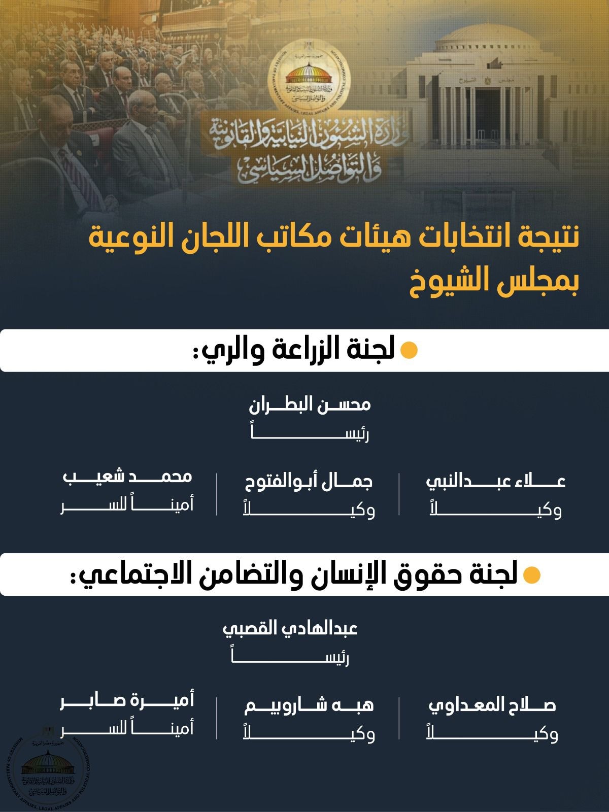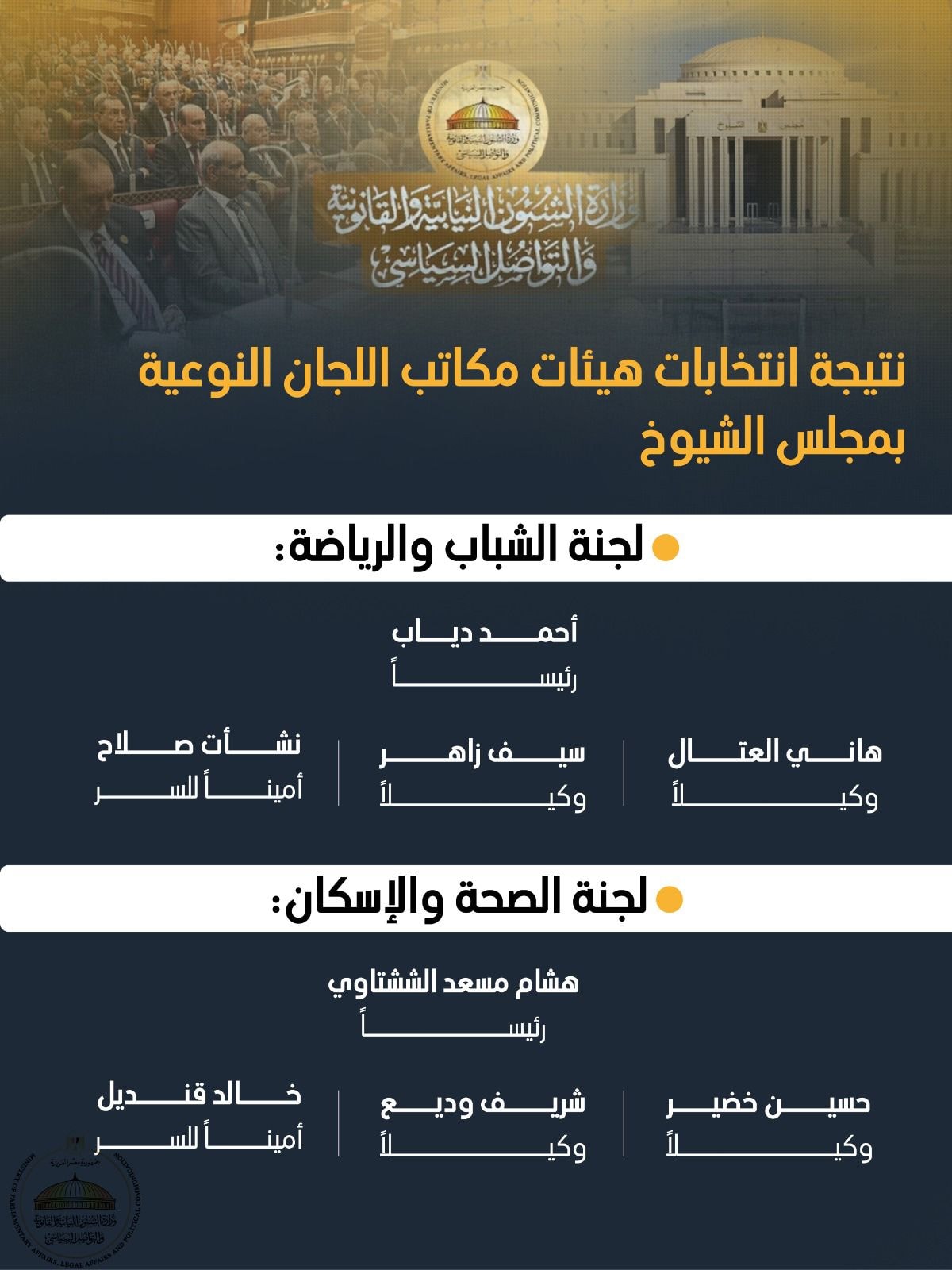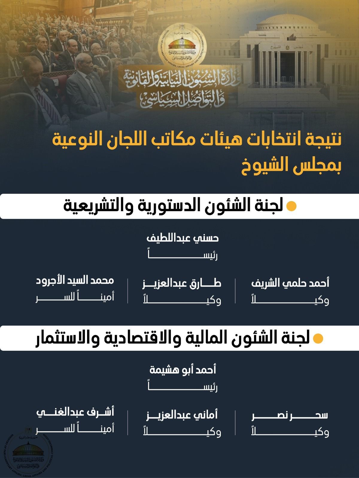 أحمد أبو هشيمة رئيسًا، وسحر نصر وأماني فاخر وكيلتين، وأشرف عبدالغني أمينًا للسر.
