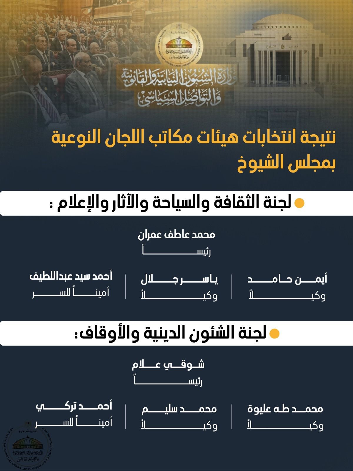 شوقي علام رئيسًا، ومحمد عليوة ومحمد سليم وكيلين، وأحمد تركي أمينًا للسر.