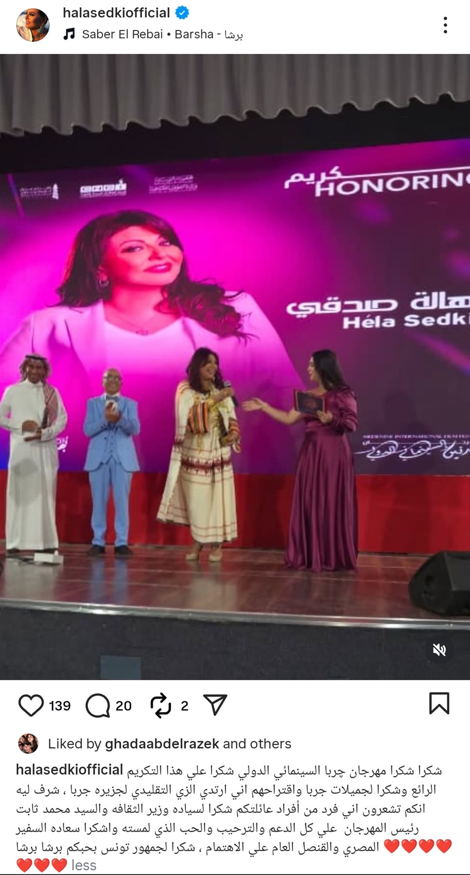 وكتبت هالة صدقي من خلال حسابها الرسمي عبر موقع تبادل الصور والفيديوهات القصيرة إنستجرام، قالت: شكرا شكرا مهرجان چربا السينمائي الدولي شكرا علي هذا التكريم الرائع وشكرا لجميلات جربا واقتراحهم اني ارتدي الزي التقليدي لجزيره جربا.