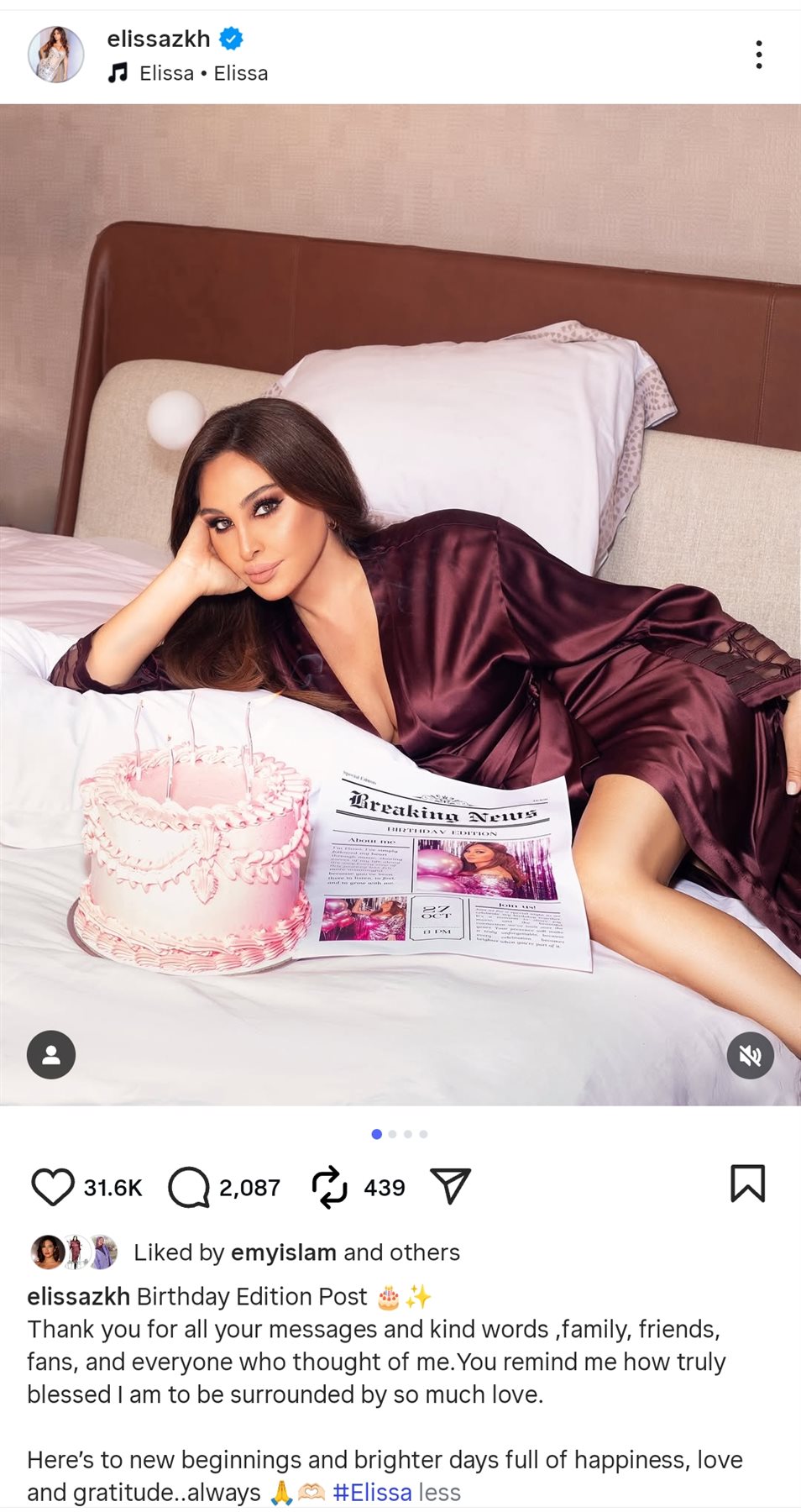 وشاركت إليسا جمهورها أحدث جلسة تصوير لها بمناسبة عيد ميلادها، وذلك من خلال حسابها الرسمي عبر موقع تبادل الصور والفيديوهات القصيرة إنستجرام، وكتبت: شكرًا لكم جميعًا على رسائلكم وكلماتكم الطيبة، ولعائلتكم وأصدقائكم ومعجبيكم وكل من فكر بي.