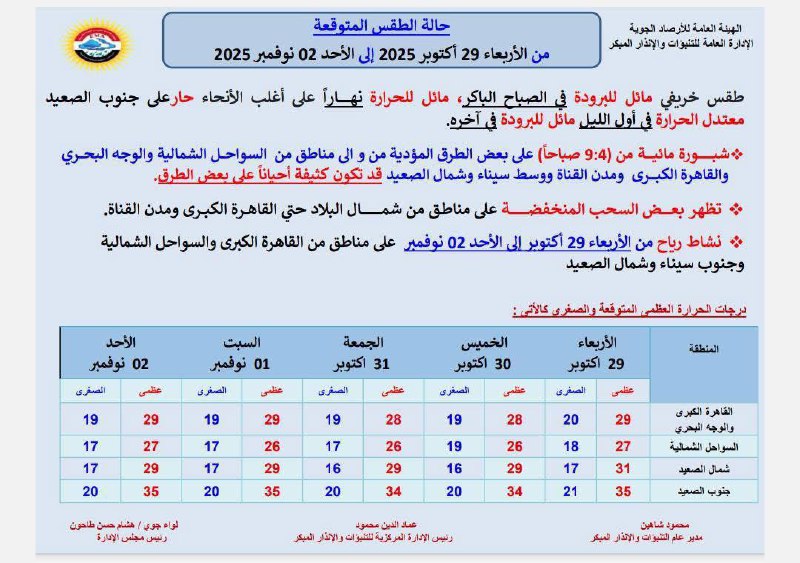 درجات الحرارة المتوقعة خلال الفترة من 29 أكتوبر إلى 2 نوفمبر