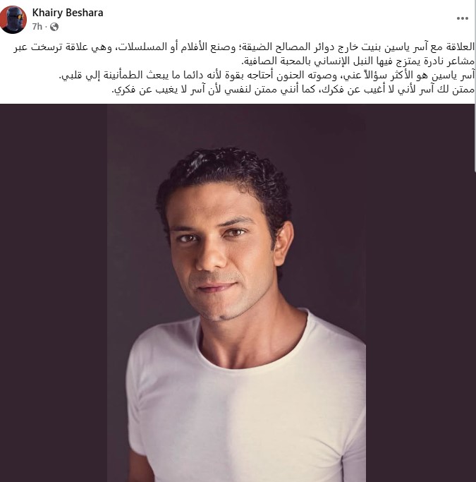 وكتب خيري بشارة من خلال حسابه الرسمي عبر موقع التواصل الاجتماعي فيسبوك: العلاقة مع آسر ياسين بنيت خارج دوائر المصالح الضيقة؛ وصنع الأفلام أو المسلسلات، وهي علاقة ترسخت عبر مشاعر نادرة يمتزج فيها النبل الإنساني بالمحبة الصافية.