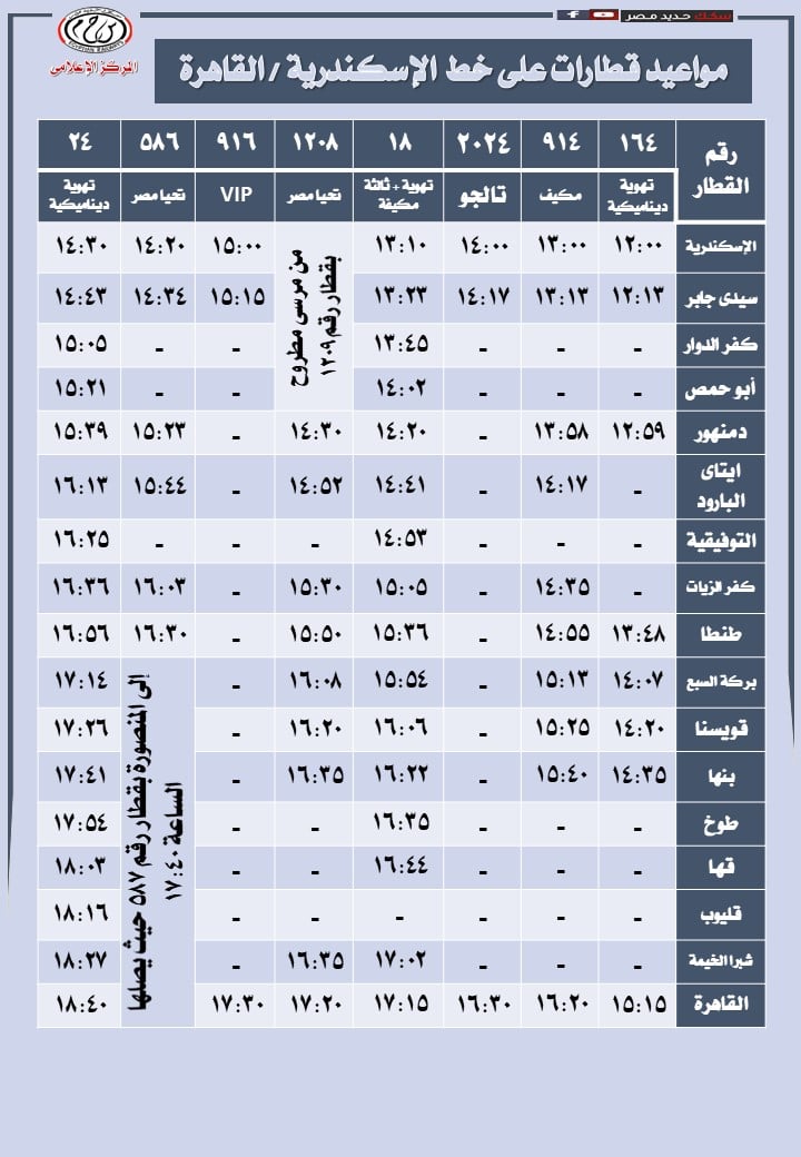 يشمل جدول مواعيد قطارات الإسكندرية القاهرة اليوم الثلاثاء 28 أكتوبر 2025، عددًا من القطارات المكيفة والروسية التي تعمل على مدار اليوم لتلبية احتياجات جميع فئات الركاب.