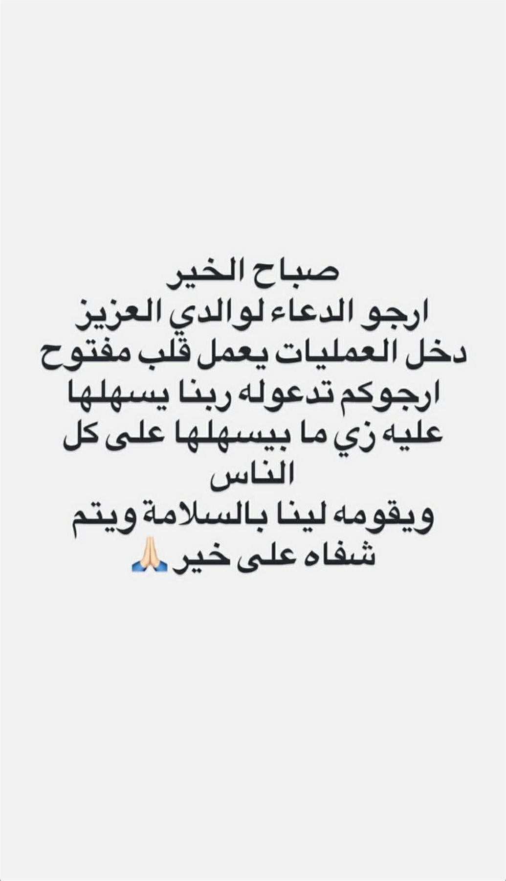 "صباح الخير.. أرجو الدعاء لوالدي العزيز، دخل العمليات يعمل قلب مفتوح، أرجوكم تدعوله، ربنا يسهلها عليه زي ما بيسهلها على كل الناس، ويقومه لينا بالسلامة ويتم شفاه على خير".