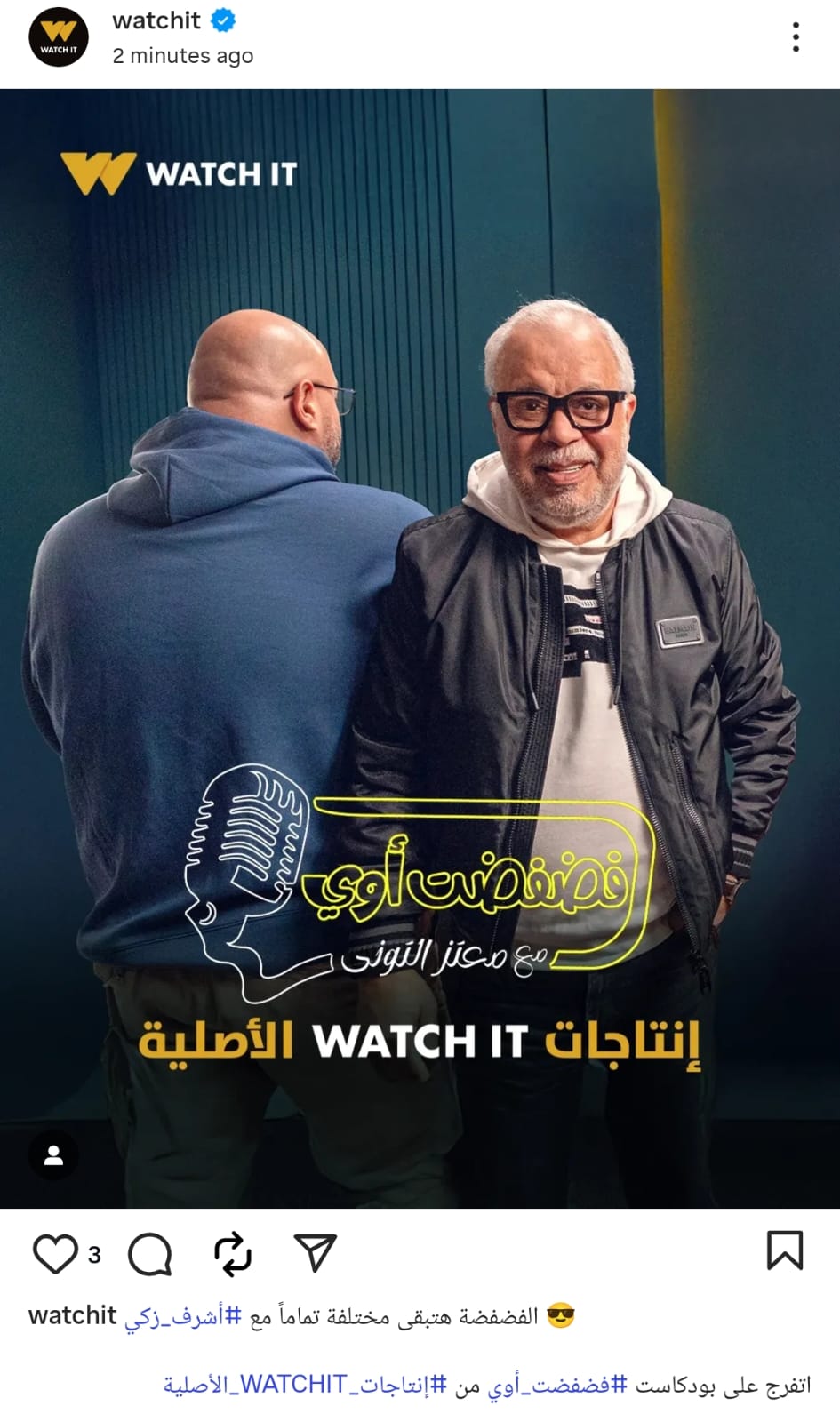 برنامج "فضفضت أوى" أحدث إنتاجات Watch it الأصلية، مكون من 30 حلقة ويذاع كل يوم أربعاء عبر منصة Watch it الرقمية، يحل خلالها 30 فنانًا ضيوفًا على المخرج معتز التوني لسرد مواقف مضحكة وكوميدية، وهم: كريم محمود عبد العزيز، والفنانة منة شلبي، والفنان محمد رضوان، والفنان محمد ثروت، والفنان هشام ماجد، والفنان عمرو يوسف، والفنان ماجد الكدواني، والفنان بيومي فؤاد، والدكتور أشرف زكي نقيب المهن التمثيلية، والفنان محمد القس، رحمة أحمد، سامي مغاوري، محمد ممدوح، أوس أوس، ميمي جمال، ميرنا جميل، أيمن وتار، أحمد فتحي، هالة فاخر، عبد الرحمن "توتا"، علاء مرسي، مصطفى أبو سريع، محمد أوتاكا، والبرنامج من إنتاج "ماجيك بينز" للمنتج أحمد الجنانيني و"روزناما" للمنتج هشام جمال.