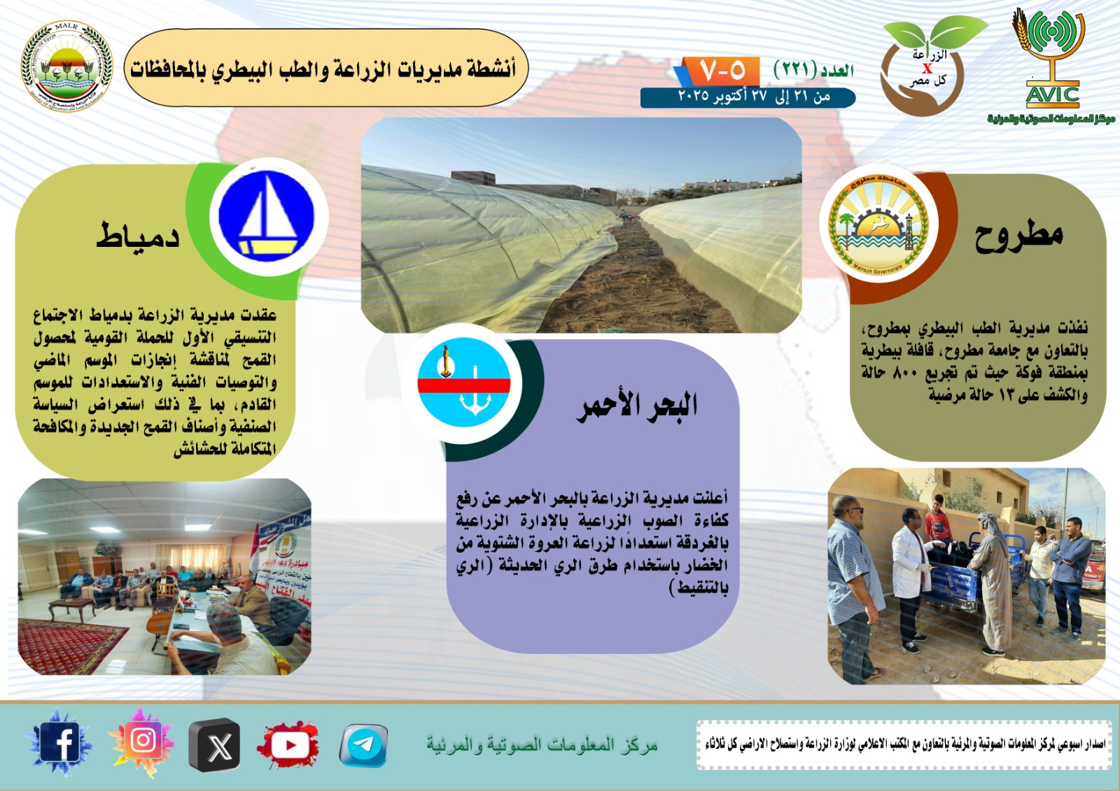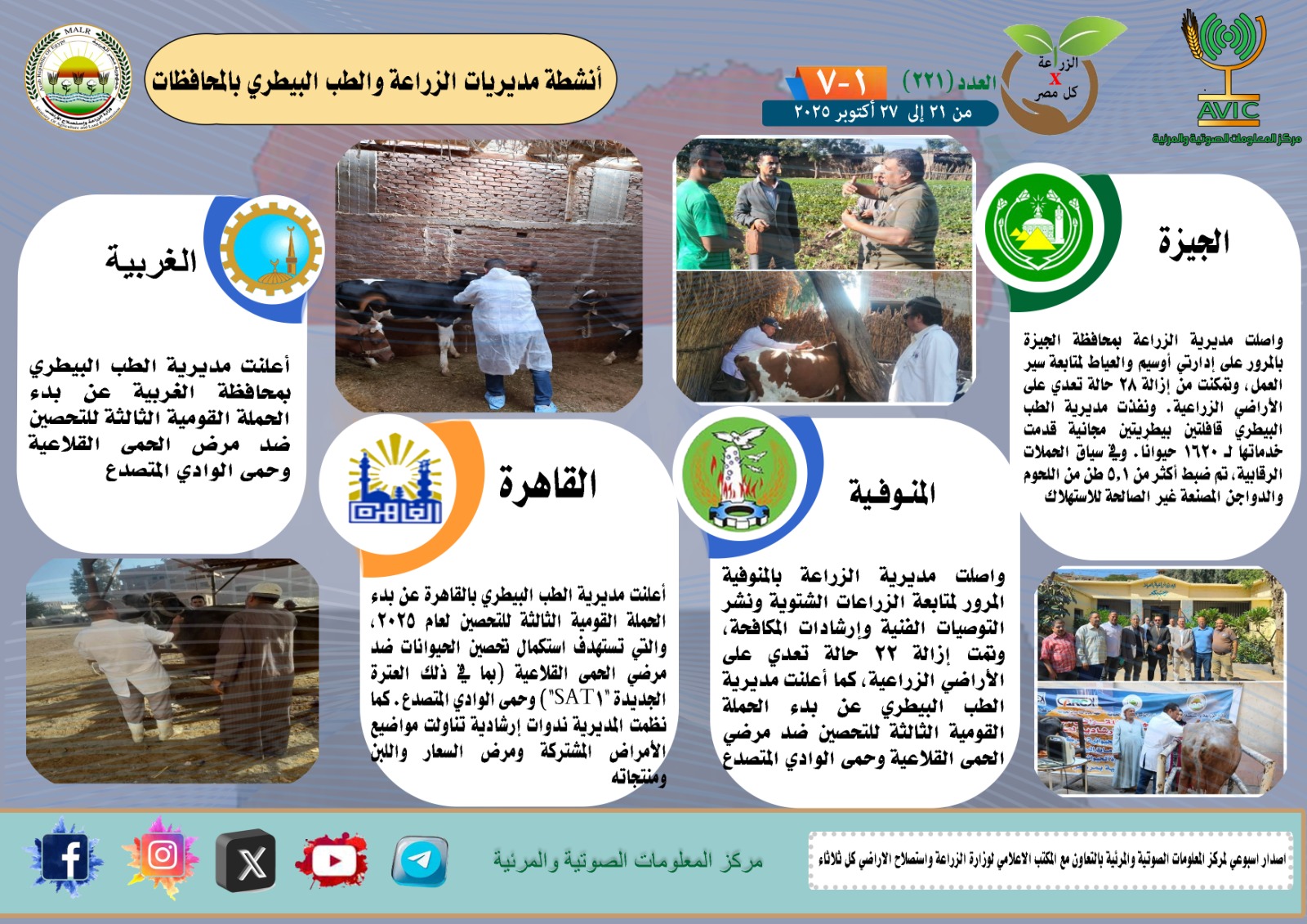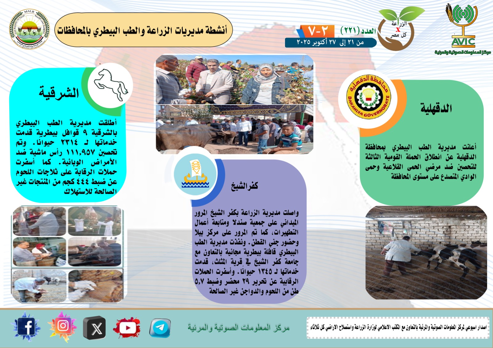أصدر مركز المعلومات الصوتية والمرئية التابع لوزارة الزراعة واستصلاح الأراضي، والمكتب الاعلامي للوزارة، العدد رقم 221 من اصدار: "الزراعة في كل مصر" بالانفوجراف والفيديو، يوضح الجهود والانشطة التي تقوم بها مديريات الزراعة والطب البيطري بمحافظات الجمهورية خلال الفترة من 21 إلى 27 اكتوبر الجاري
