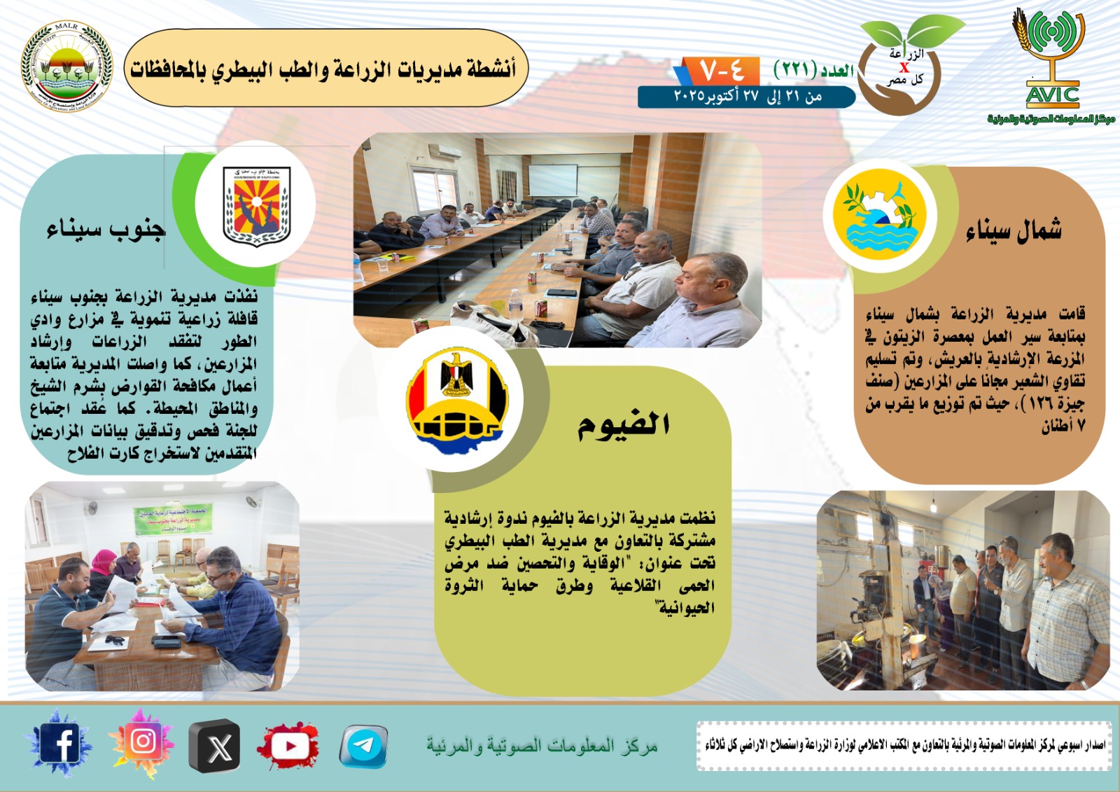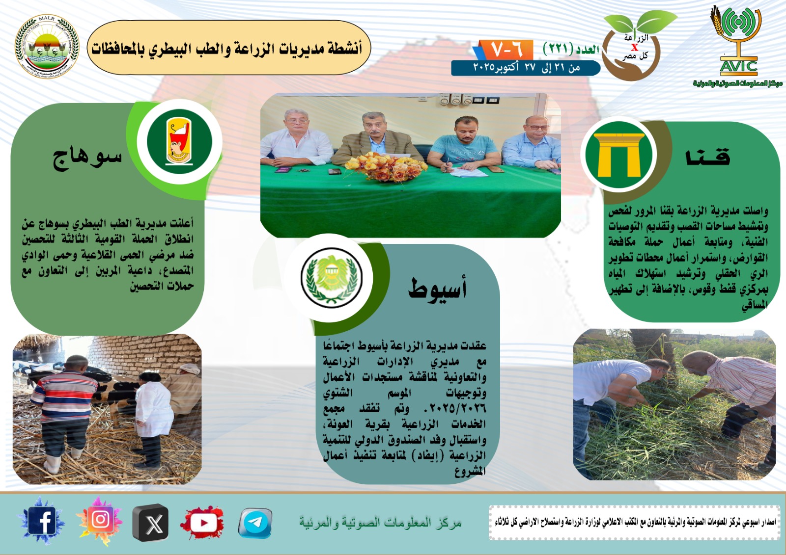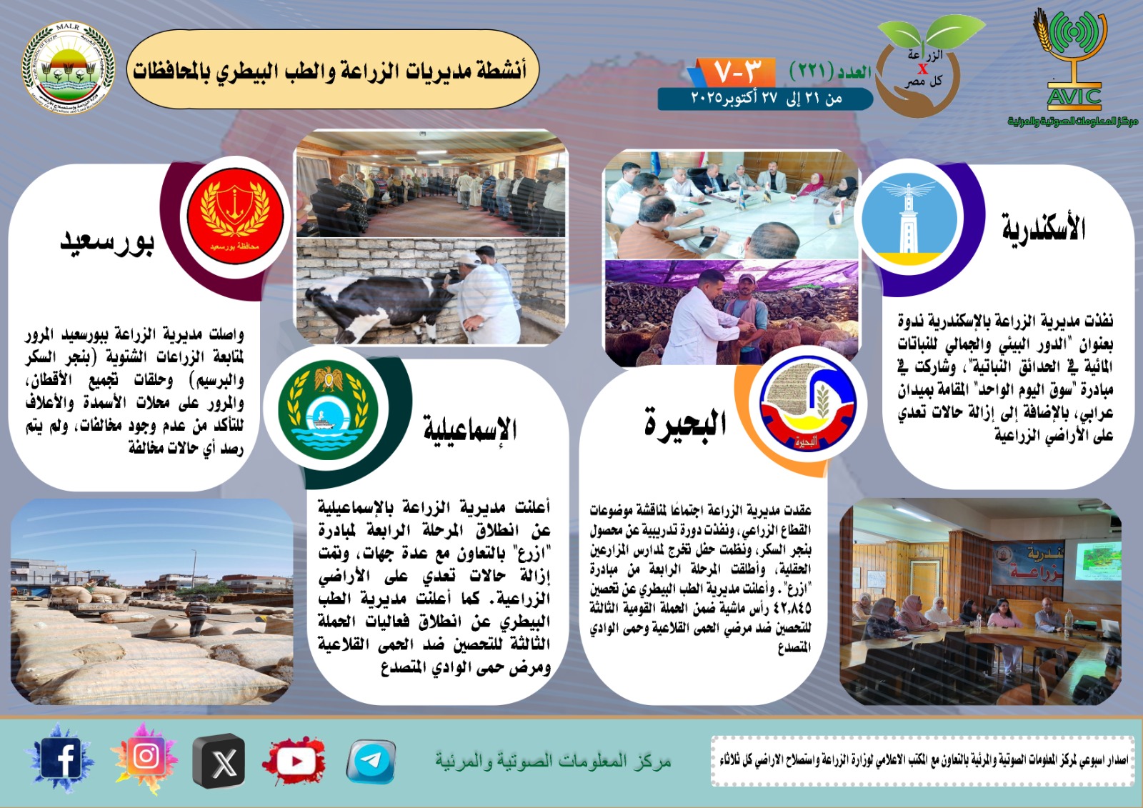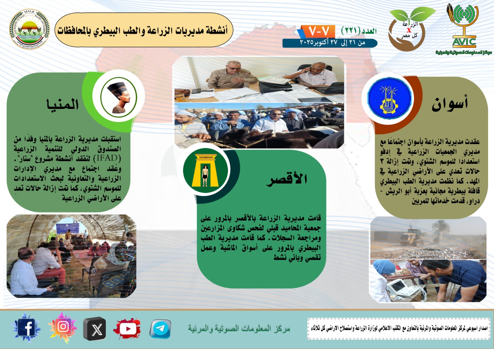 أصدر مركز المعلومات الصوتية والمرئية التابع لوزارة الزراعة واستصلاح الأراضي، والمكتب الاعلامي للوزارة، العدد رقم 221 من اصدار: "الزراعة في كل مصر" بالانفوجراف والفيديو، يوضح الجهود والانشطة التي تقوم بها مديريات الزراعة والطب البيطري بمحافظات الجمهورية خلال الفترة من 21 إلى 27 اكتوبر الجاري