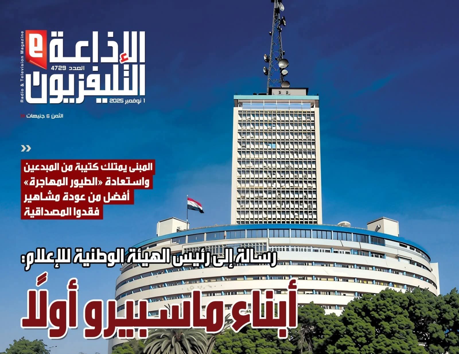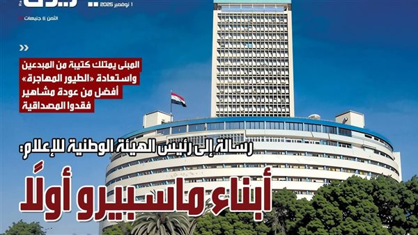 أصدرت مجلة الإذاعة والتليفزيون عددها الجديد رقم (4729) الذي من المقرر إصداره في الأول من نوفمبر 2025، وتناول عنوان المجلة : "أبناء ماسبيرو أولاً"، في رسالة مباشرة إلى رئيس الهيئة الوطنية للإعلام، تؤكد أهمية دعم أبناء المبنى العريق وتمكينهم من المشاركة في تطوير الإعلام الوطني.