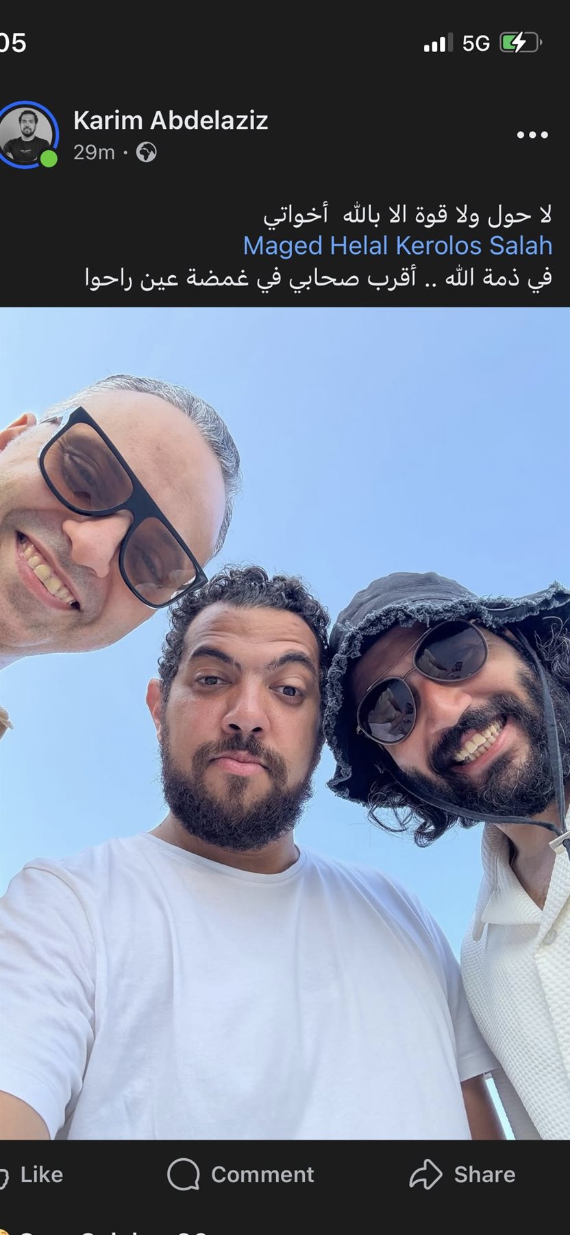 كما نعي محمد خالد صديق ماجد هلال، قائلا: “توفي الي رحمة الله تعالي اخويا وصديق الكفاح ماجد هلال اللهم اغفر له و ارحمه و ادخله فسيح جناتك اللهم اكرم نزله و وسع مدخله ربنا يثبته عند السؤال و يجعله ممن اختارهم شهداء في الجنة إن شاء الله يا رب اللهم آمين”.
