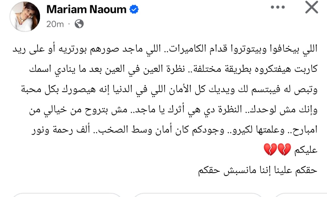 أضافت: النظرة دي هي أثرك يا ماجد.. مش بتروح من خيالي من امبارح.. وعلمتها لكيرو.. وجودكم كان أمان وسط الصخب.. ألف رحمة ونور عليكم.. حقكم علينا إننا مانسبش حقك.