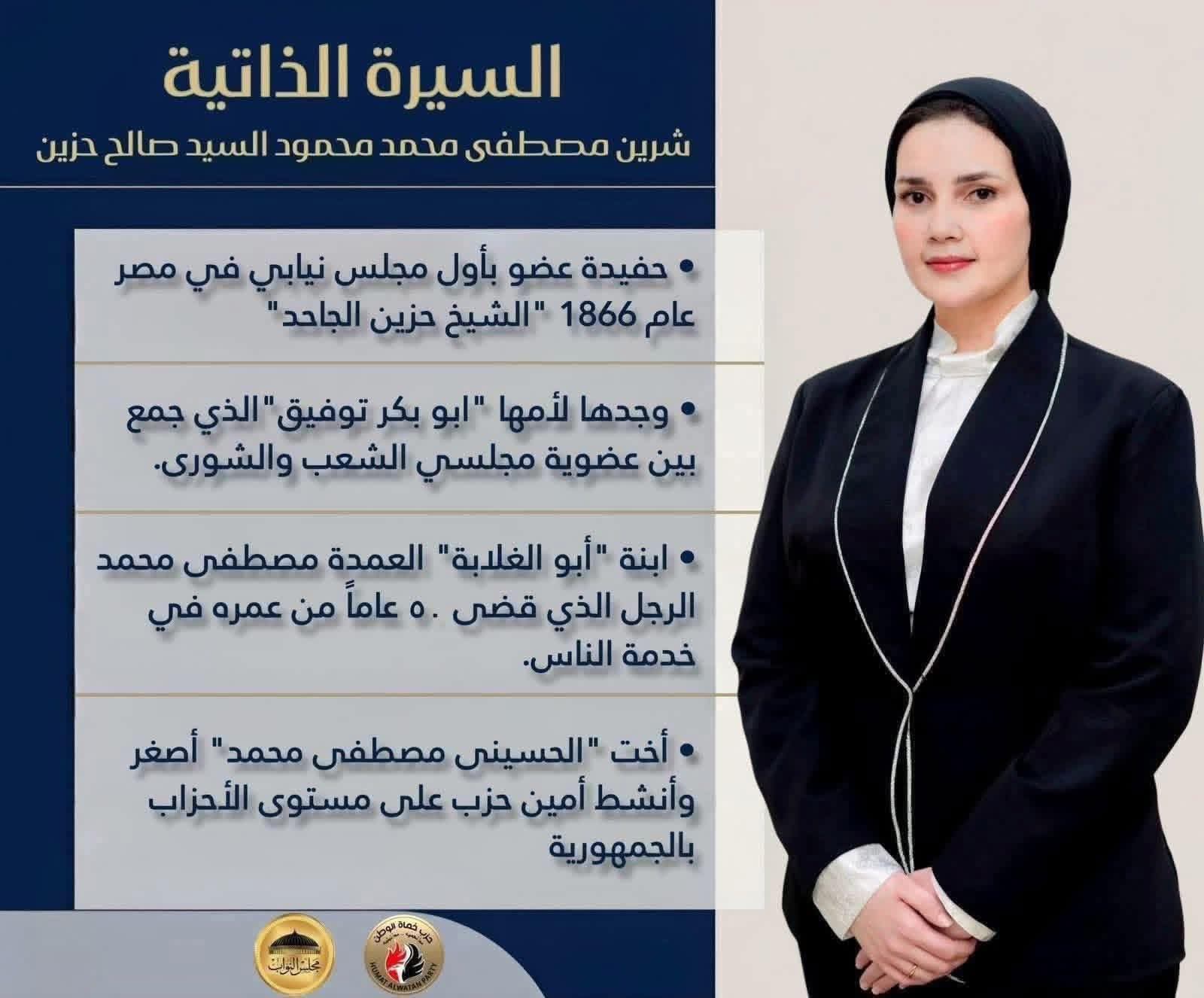 وتضمّنت السيرة الذاتية تفاصيل نسب المرشحة، حيث عرفت نفسها بأنها حفيدة الشيخ حزين الجاحد، عضو أول مجلس نيابي في مصر عام 1866، مشيرة إلى أن جدها من جهة الأم هو أبو بكر توفيق، الذي جمع بين عضوية مجلسي الشعب والشورى.