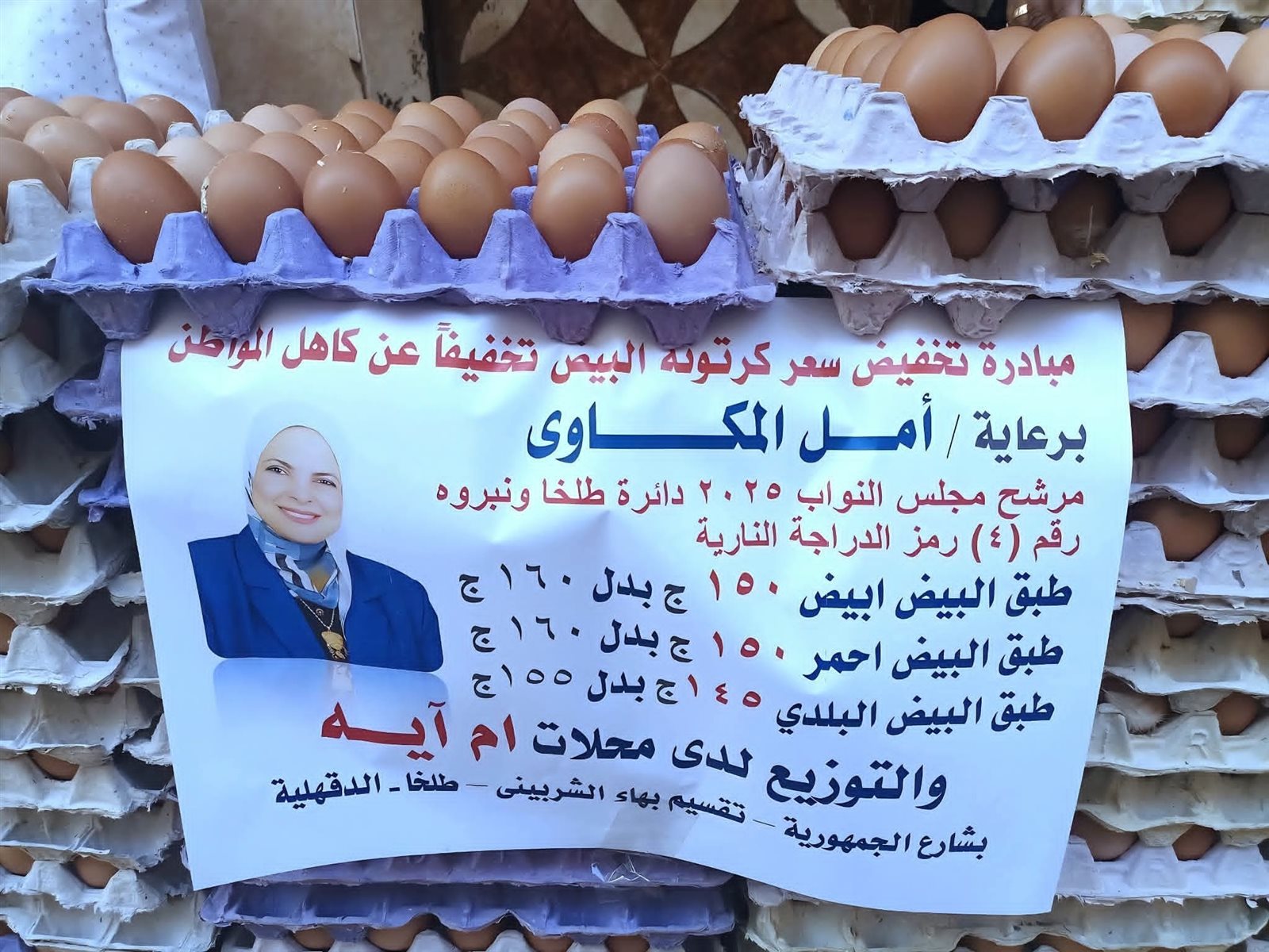 وحملت المبادرة اسم "مبادرة تخفيض سعر كرتونة البيض"، ونُفذت برعاية المرشحة أمل المكاوي (رقم 4 – رمز الدراجة النارية)، حيث جرى بيع طبق البيض الأبيض والأحمر بسعر 150 جنيهًا بدلًا من 160 جنيهًا، فيما بلغ سعر البيض البلدي 145 جنيهًا بدلًا من 155 جنيهًا، على أن يتم التوزيع من خلال محلات “إم آيه” بشارع الجمهورية – تقسيم بهاء الشربيني – طلخا.