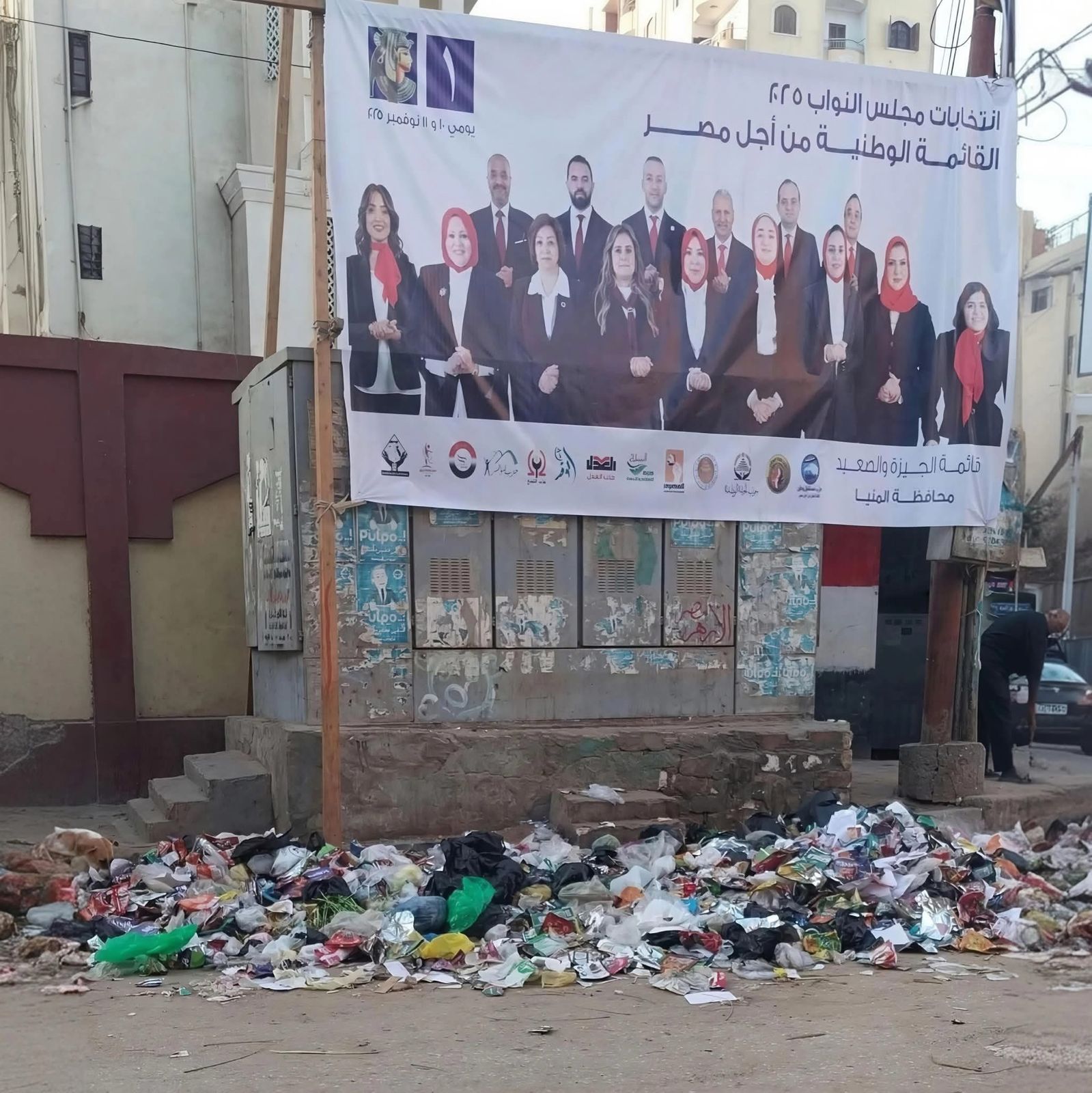 وأظهرت الصورة التي تم التقاطها في أحد الشوارع، لافتة تضم صور عدد من مرشحي القائمة الوطنية، في حين بدا أسفلها مشهد غير لائق لوجود مخلفات وعبوات قمامة، ما دفع العديد من المستخدمين إلى التعليق بسخرية على المشهد، معتبرين أنه يظهر "تناقضًا" بين الشعارات الانتخابية الداعية للتطوير والنظافة، والواقع المحيط بها.