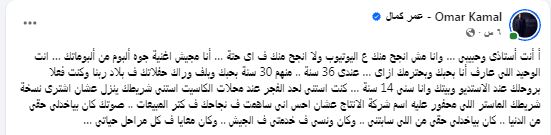 وقال عمر كمال عبر حسابه الرسمي "فيس بوك"" أنت استاذى وحبيبى … وانا مش انجح منك ع اليوتيوب ولا انجح منك ف اى حتة ، انا مجيش اغنية جوه ألبوم من ألبوماتك".