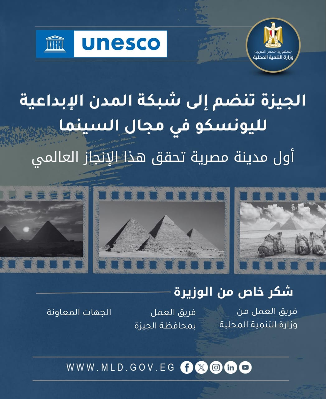 وأضافت أن اختيار منظمة اليونسكو لمحافظة الجيزة ضمن 58 مدينة جديدة انضمت إلى الشبكة هذا العام، جاء تتويجًا لجهود عمل جماعي متكامل بين وزارة التنمية المحلية ومحافظة الجيزة، حيث تولت إدارة التعاون الدولي بالوزارة إعداد ملف الترشح والتنسيق مع المنظمة، بمساندة فاعلة من فريق المحافظة، بما أبرز المقومات الفنية والثقافية للجيزة وريادتها التاريخية في مجال السينما والإنتاج الفني.
