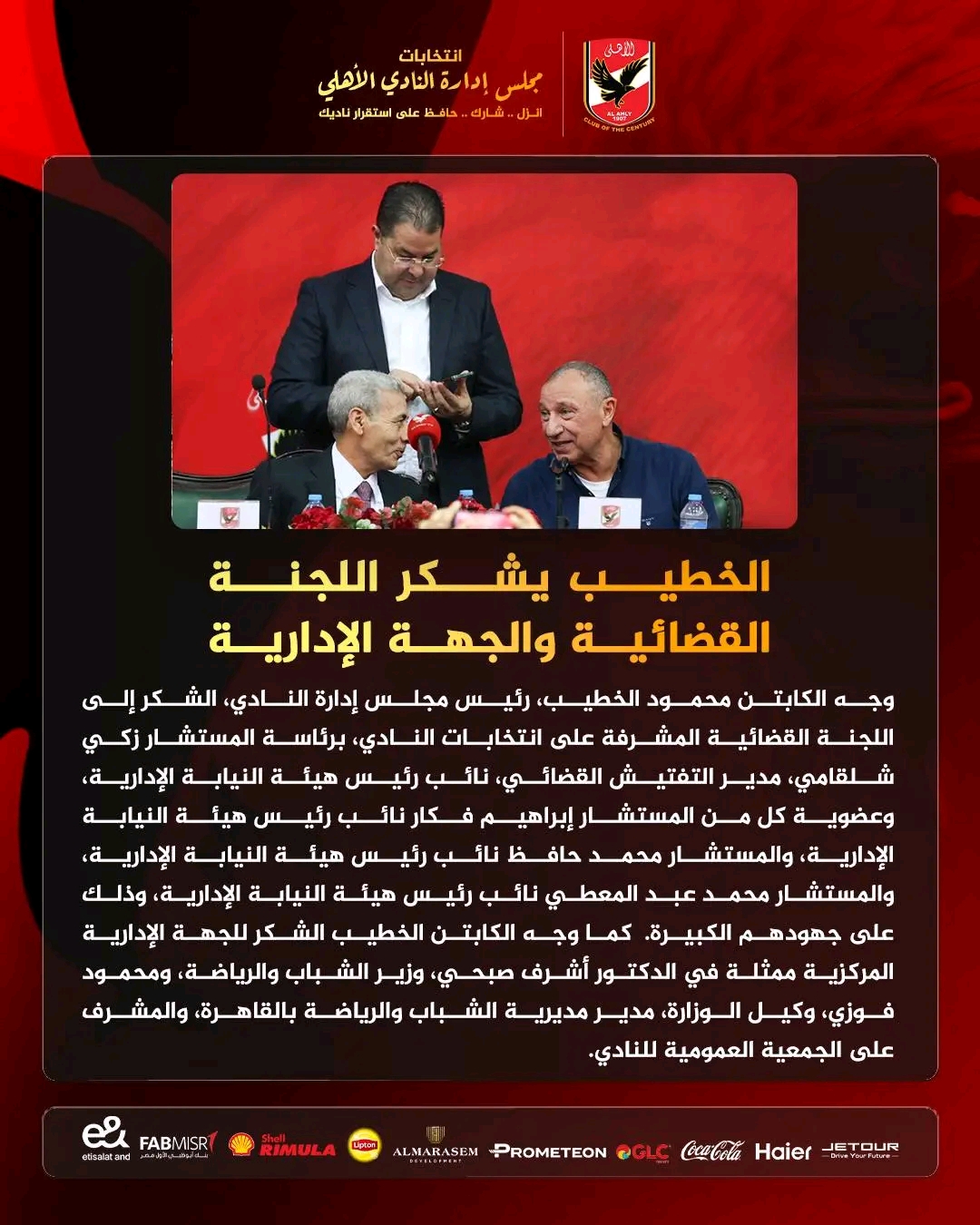 وجه الكابتن محمود الخطيب، رئيس مجلس إدارة النادي الأهلي، الشكر إلى اللجنة القضائية التي أشرفت على انتخابات النادي، وكذلك إلى الجهة الإدارية التي تابعت العملية الانتخابية.