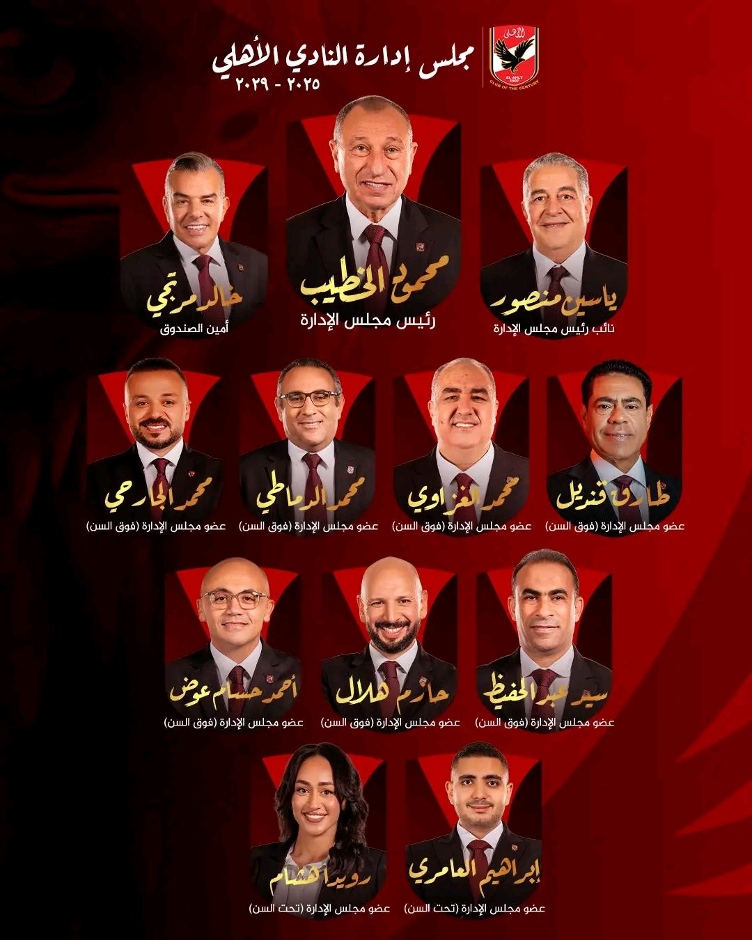 أعلن النادي الأهلي رسميًا عن نتائج انتخابات مجلس الإدارة للدورة الجديدة 2025-2029، حيث فازت قائمة الكابتن محمود الخطيب بالكامل بالتزكية في جميع المناصب، وذلك بعد اكتمال النصاب القانوني بحضور أعضاء الجمعية العمومية.