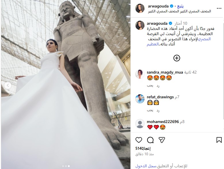وشاركت أروى جودة جمهورها صورًا لها أثناء وجودها بالمتحف المصري الكبير، بإطلالة فرعونية من اللون الأبيض، وذلك من خلال حسابها الرسمي عبر موقع تبادل الصور والفيديوهات القصيرة إنستجرام، وكتبت: فخور جدًا بأن أكون أحد أحفاد هذه الحضارة العظيمة.. ويشرفني أن أتيحت لي الفرصة لإجراء هذا التصوير في المتحف المصري العظيم أثناء بنائه.