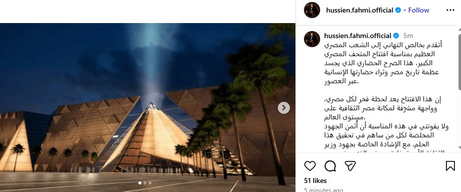 وكتب حسين فهمي من خلال حسابه الرسمي عبر موقع تبادل الصور والفيديوهات القصيرة إنستجرام، قال: أتقدم بخالص التهاني إلى الشعب المصري العظيم بمناسبة افتتاح المتحف المصري الكبير، هذا الصرح الحضاري الذي يجسد عظمة تاريخ مصر وثراء حضارتها الإنسانية عبر العصور.