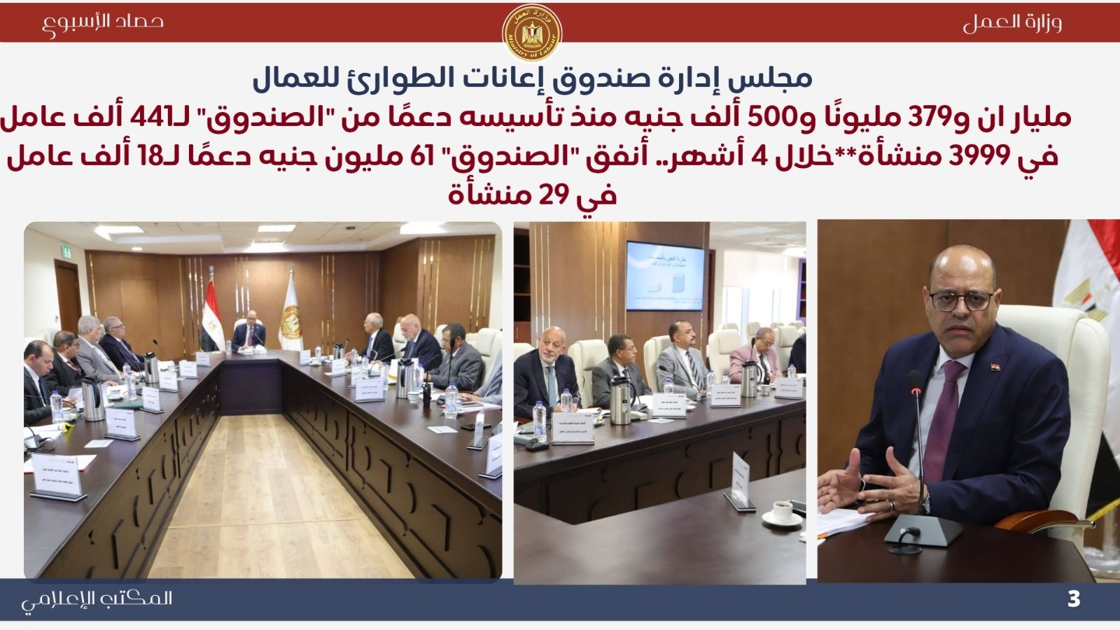 أعلن مجلس إدارة صندوق إعانات الطوارئ للعمال برئاسة وزير العمل محمد جبران أن الصندوق أنفق 2.379 مليار جنيه دعمًا لـ 441 ألف عامل في 3999 منشأة منذ تأسيسه عام 2002، منها 61 مليون جنيه خلال 4 أشهر فقط لدعم 18 ألف عامل.