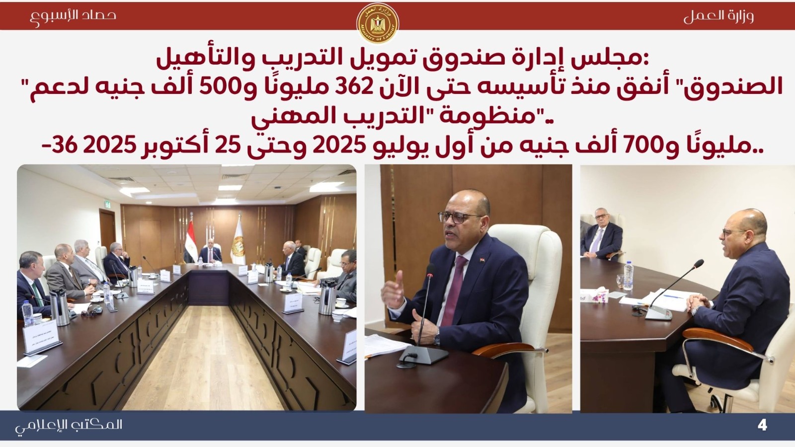 أعلن مجلس إدارة صندوق تمويل التدريب والتأهيل برئاسة وزير العمل محمد جبران أن الصندوق أنفق 36.7 مليون جنيه خلال 4 أشهر، ليصل إجمالي ما تم إنفاقه منذ تأسيسه إلى 362.5 مليون جنيه لدعم منظومة التدريب المهني وإنشاء وتطوير المراكز والوحدات التدريبية، تنفيذًا لتوجيهات القيادة السياسية بتأهيل الشباب لسوق العمل المحلي والدولي.