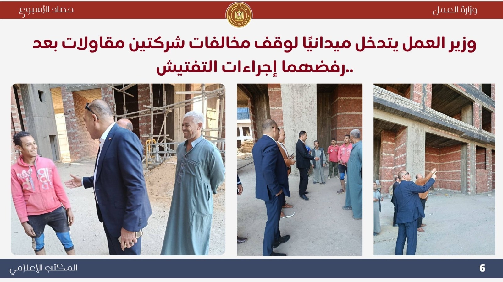 توجّه الوزير محمد جبران ميدانيًا إلى مواقع عمل بعد رفض شركتين إجراءات التفتيش، وأصدر قرارًا بوقف العمل الفوري لحين استيفاء اشتراطات السلامة، مشددًا على أن الوزارة لن تتهاون مع المخالفين حمايةً لأرواح العمال وحقوقهم.