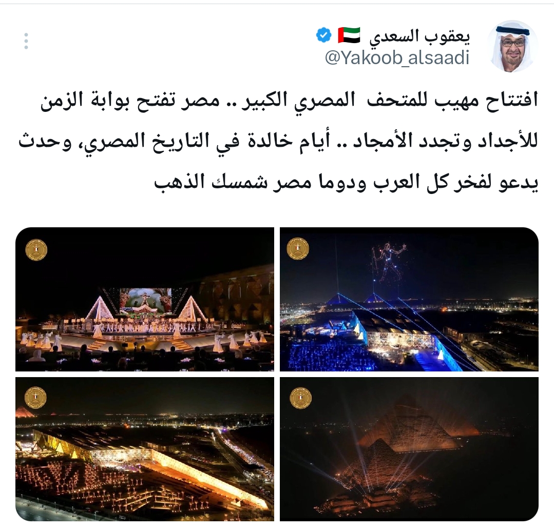 أعرب الإعلامي الإماراتي البارز يعقوب السعدي عن فخره الكبير بالافتتاح المهيب للمتحف المصري الكبير، واصفًا إياه بالحدث التاريخي الذي يجدد الأمجاد.