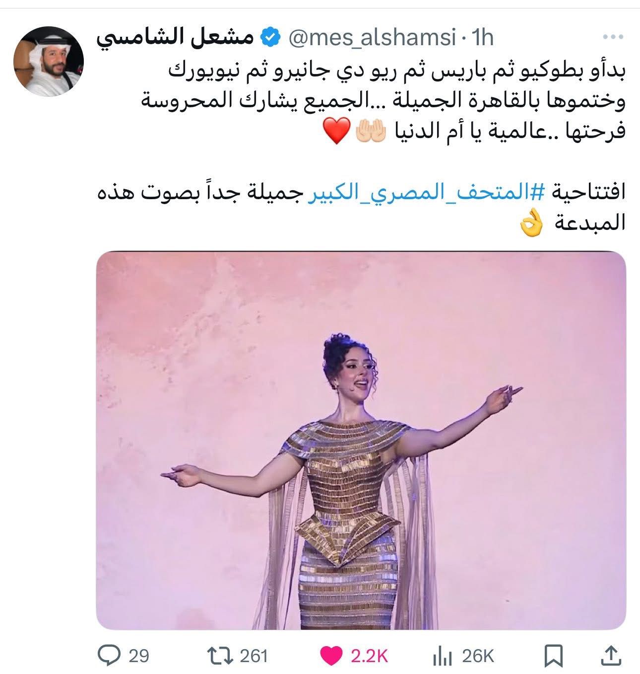 مشعل الشامسي يهنئ المصريين ويشيد بالمبدعة شيرين أحمد في حفل افتتاح المتحف المصري الكبير