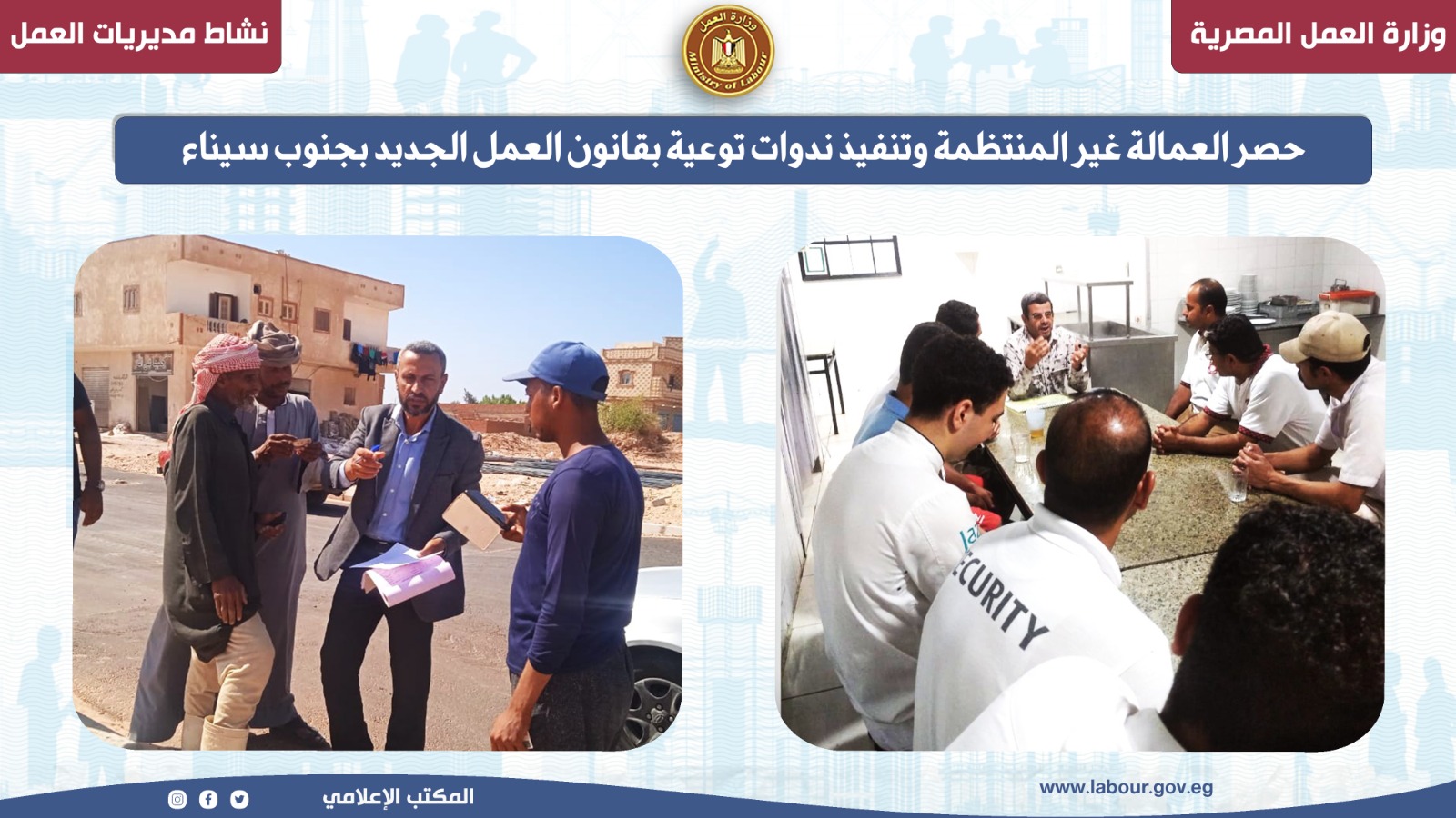 5-حصر العمالة غير المنتظمة وتنفيذ ندوات توعية بقانون العمل الجديد بجنوب سيناء