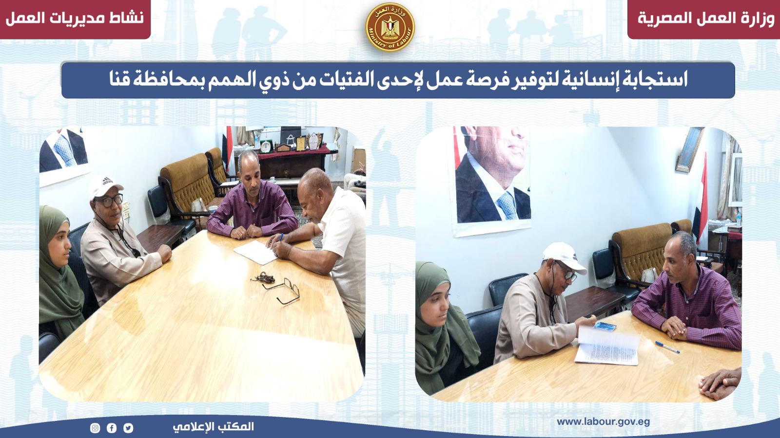 وجه الوزير محمد جبران وزير العمل بتوفير فرصة عمل مناسبة لإحدى الفتيات من ذوي الهمم من محافظة الأقصر، وذلك بعد رصد استغاثتها عبر وسائل التواصل، حيث تم التنسيق الفوري لتعيينها بإحدى المنشآت التابعة لمديرية العمل بمحافظة قنا بنظام العمل عن بُعد بما يتناسب مع ظروفها الصحية، تنفيذًا لتوجيهات الوزارة في دعم وتمكين الأشخاص من ذوي القدرات الخاصة وإتاحة فرص عمل ملائمة لهم.