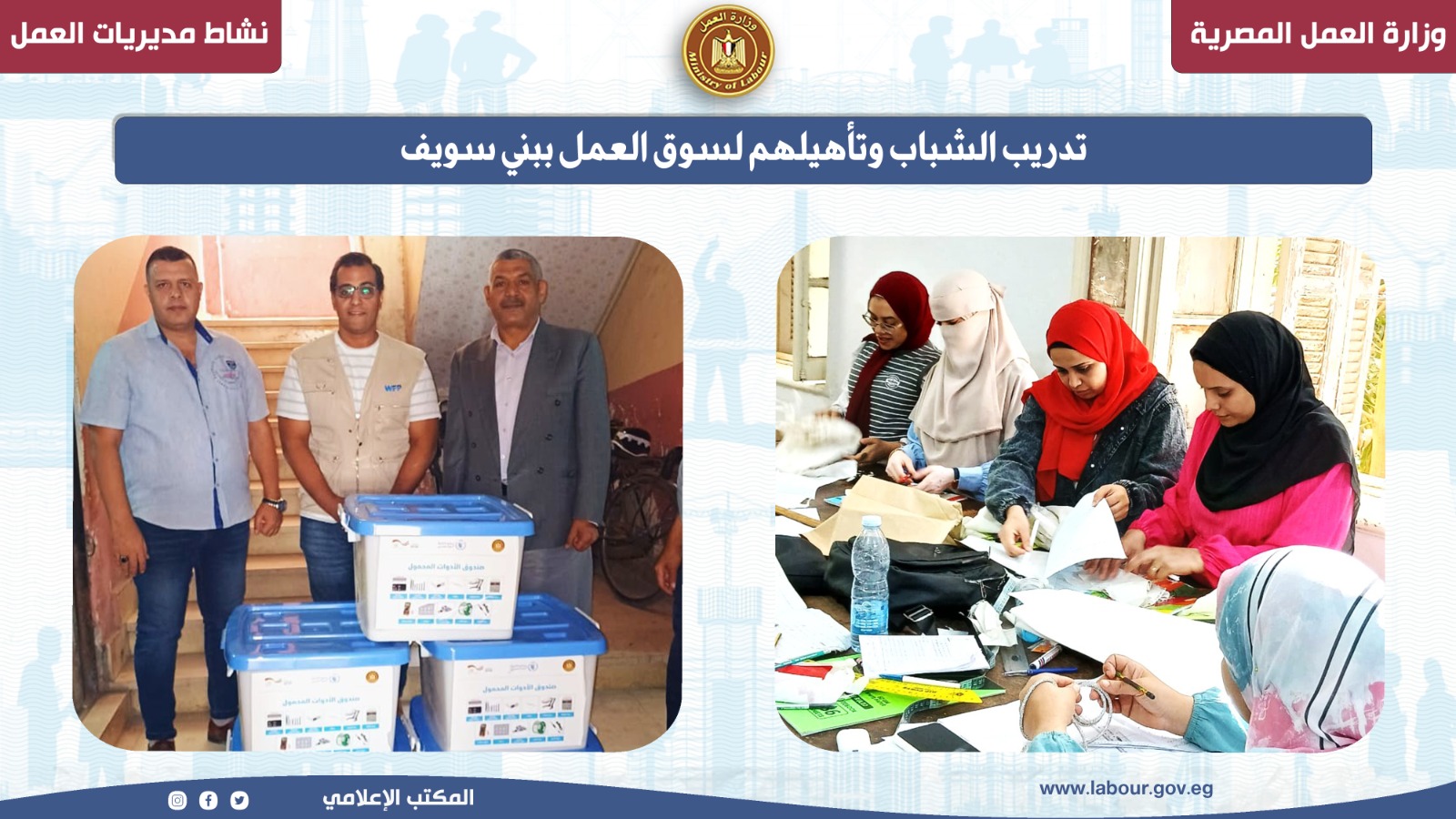نظّمت مديرية العمل ببني سويف عددًا من الأنشطة التدريبية في إطار التعاون المثمر بين وزارة العمل وبرنامج الغذاء العالمي، وتنفيذًا لتوجيهات الوزير محمد جبران وزير العمل، وحرص الوزارة على تأهيل الشباب لسوق العمل في الداخل والخارج، حيث شهد المهندس أحمد العربي مدير مديرية العمل ببني سويف تسليم عدد (9) حقائب لصيانة الهواتف المحمولة تحتوي على أدوات ومعدات فنية لشباب المتدربين المتميزين من خريجي برنامج صيانة المحمول، إلى جانب عدد من الحقائب الممنوحة لمركز التدريب المهني بشرق النيل دعمًا لبرامج التدريب بالمركز.