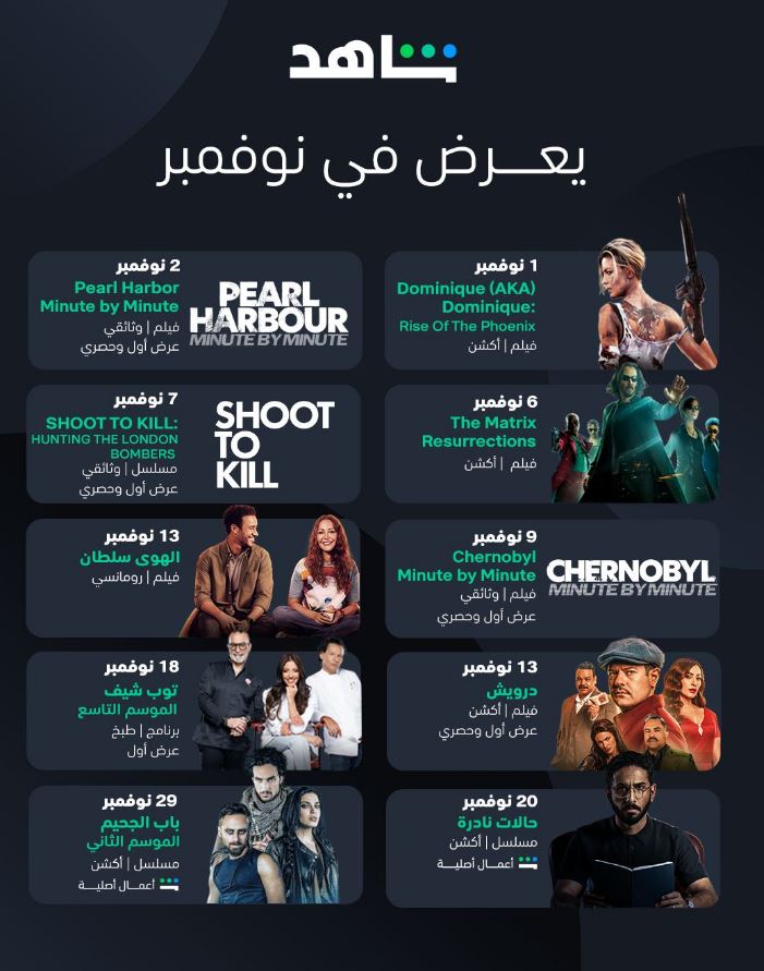 ونشرت منصة شاهد عبر حسابها الرسمي "فيس بوك" خريطة أجدد أعمالها التي سوف تعرض على المنصة خلال شهر نوفمبر الجاري .