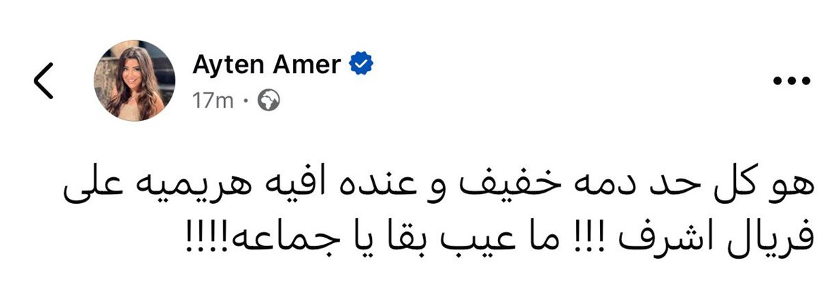 نشرن أيتن عامر، رسالة حادة عبر حسابها على موقع “فيس بوك”، قائلة: "هو كل حد دمه خفيف، وعنده إفيه، هيرميه على فريال أشرف؟ ما عيب يا جماعة".