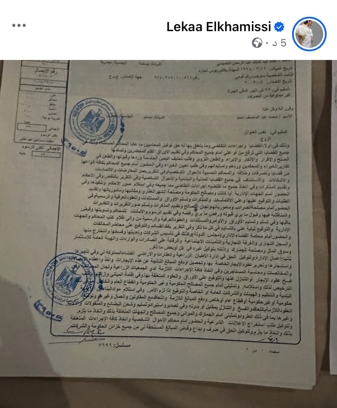 نشرت الفنانة لقاء الخميسي، صورة توكيل عام لزوجها حارس مرمي منتخب مصر والزمالك السابق محمد عبد المنصف علي حسابها الرسمي بموقع “فيس بوك”.