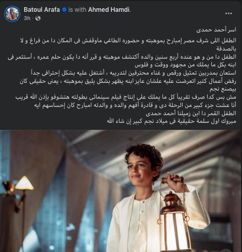 وكتبت بتول، عبر صفحتها الشخصية على موقع “فيس بوك”، قائلة: «اسر أحمد حمدي الطفل اللى شرف مصر إمبارح بموهبته و حضوره الطاغي».